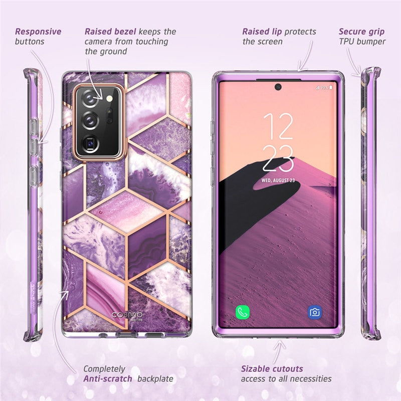 The Cosmo For Samsung Galaxy Note 20 Ultra proves cases can be both protective and posh. This slim designer case offers the same i-Blason full-body protection that for years has defended your phones. The difference? It's now available in elegant, cute, sassy, designs-from pink and white stars and relaxing river steams to magnificent marble and purple glitter. So pick your pretty. And feel confident that the Cosmo has got your back. Even the harshest bumps and falls will never have a chance against this case.