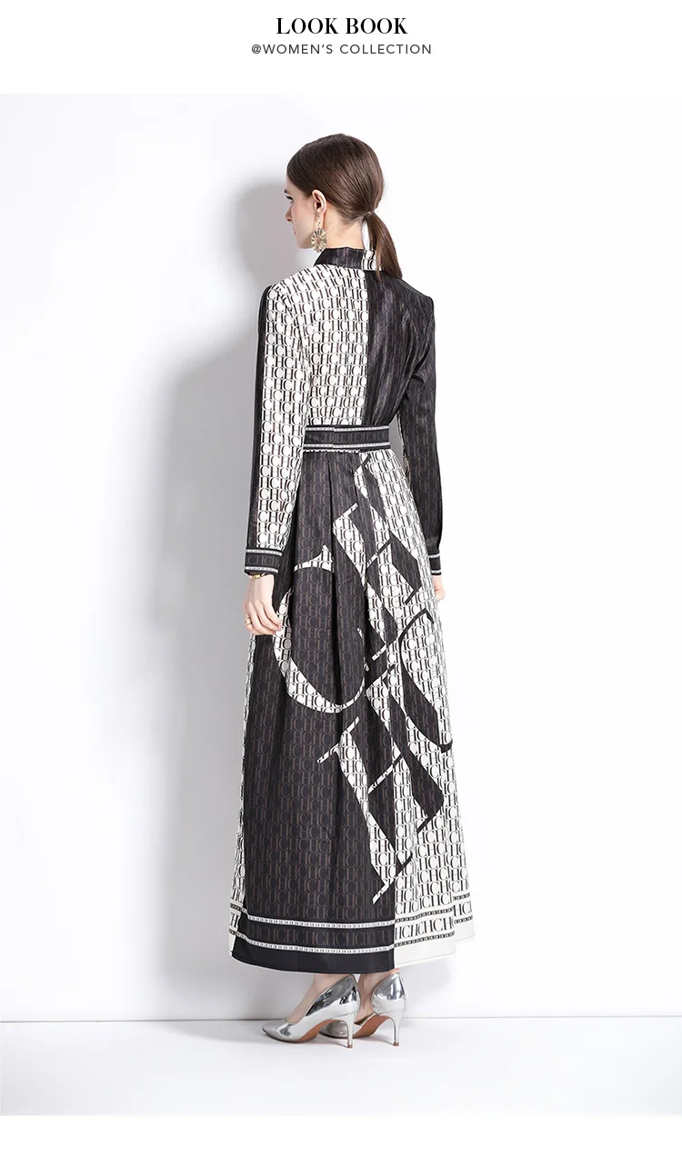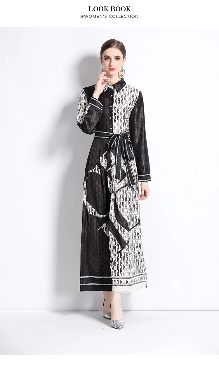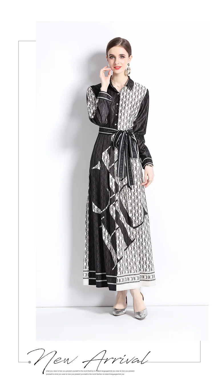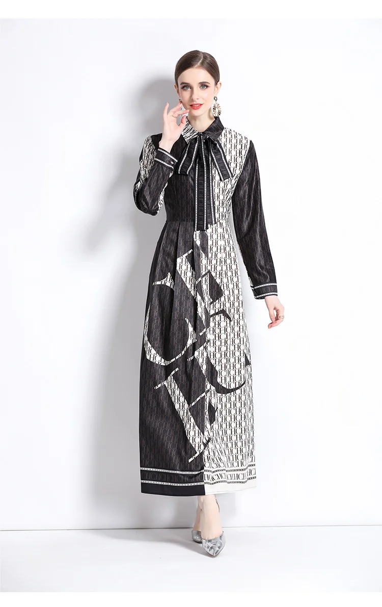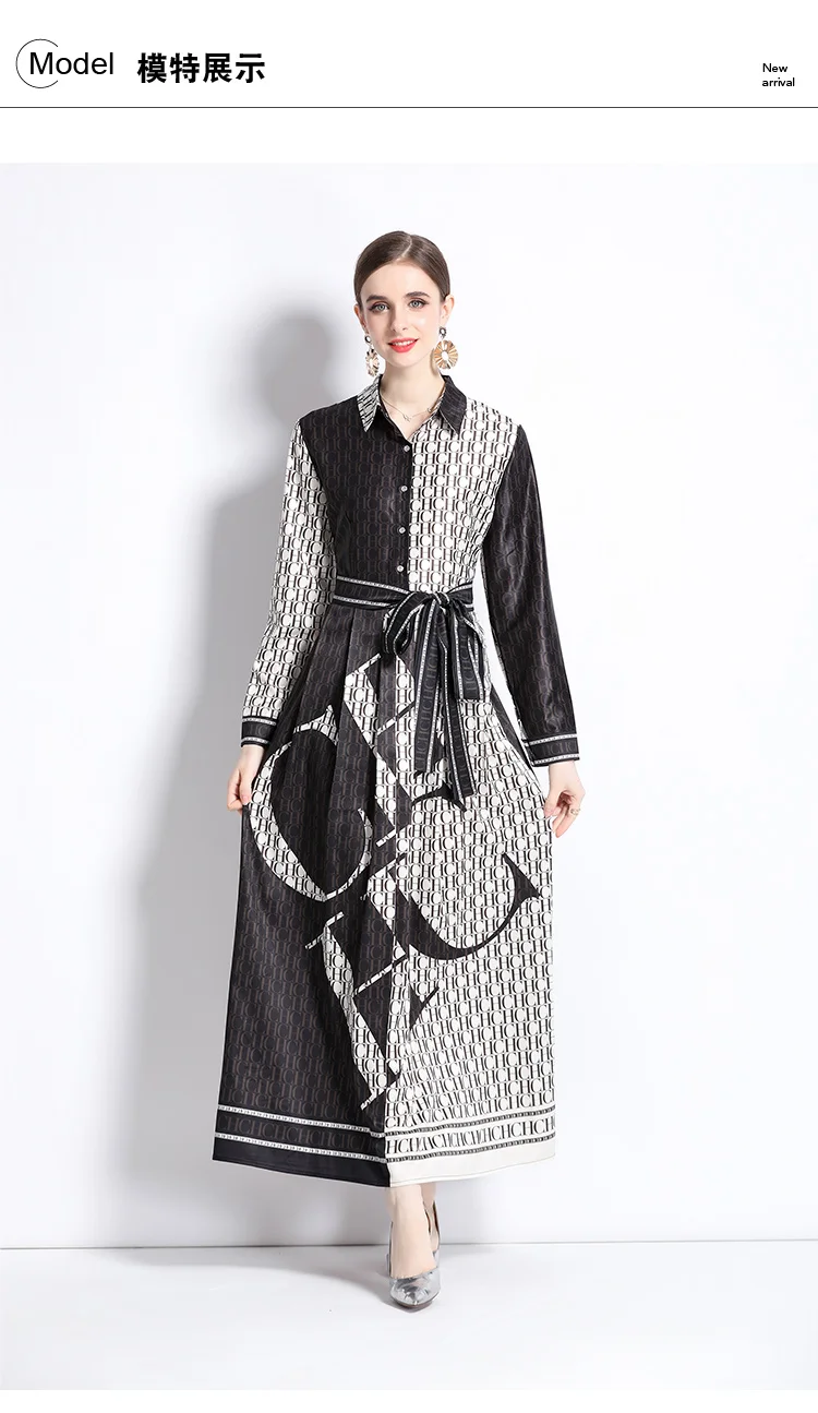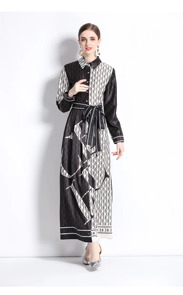 Runway Autumn Letter Print Shirt Dress Women's Lapel Collar Long Sleeve Lace Up Bow Belt A Line Vintage Party Vestidos M9881