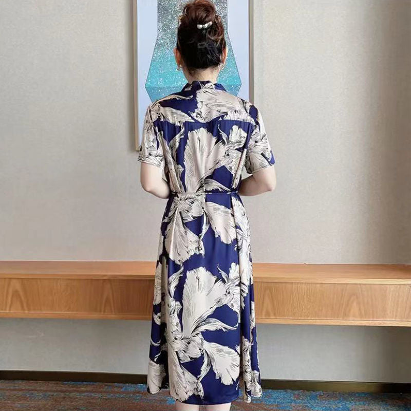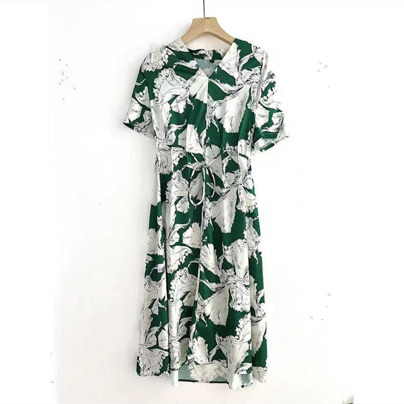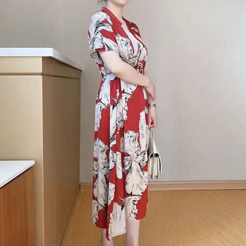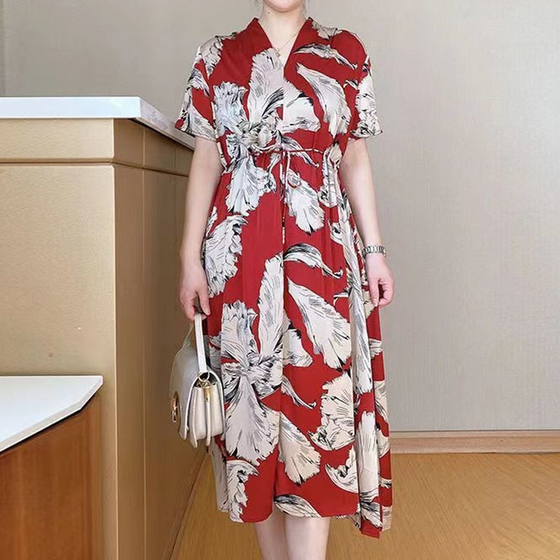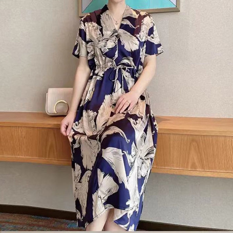 Summer New Print V Neck Knee Length Loose Midi Dress Short Sleeve Sashes High Waist Ladies Dresses Elegant Fashion Women Clothes