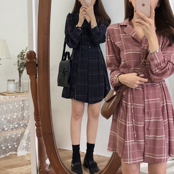 2019 Spring Summer Basic Dresses Hot Women Fashion Long Sleeve Cute Preppy Style Red Plaid Shirt Dress Bow Tie Vintage Dress