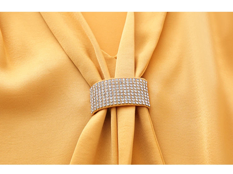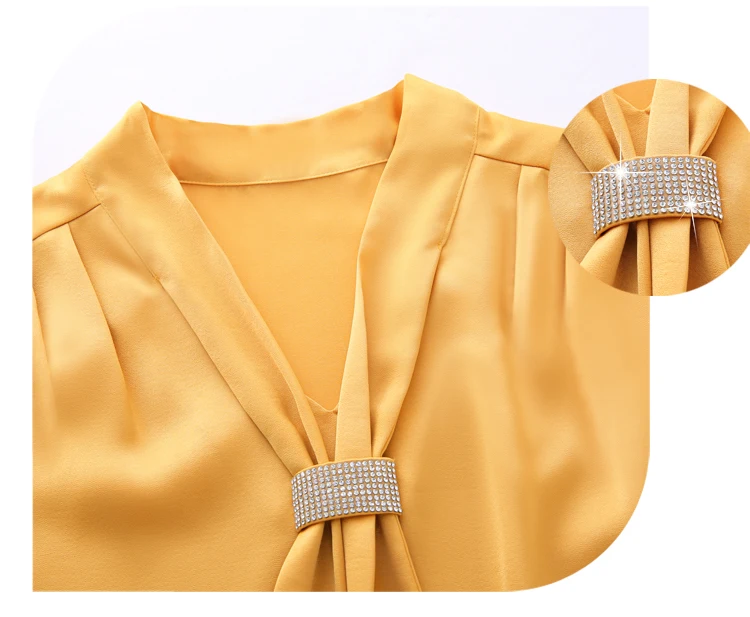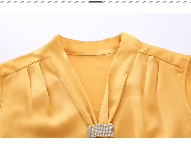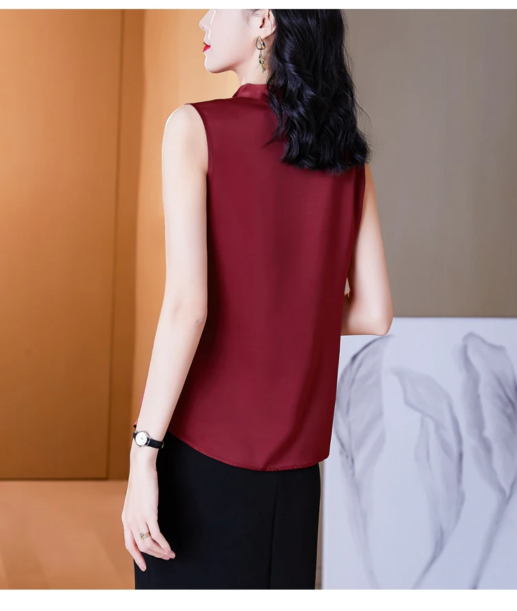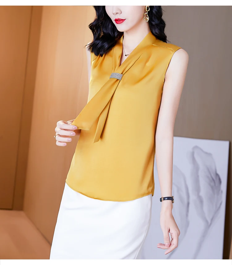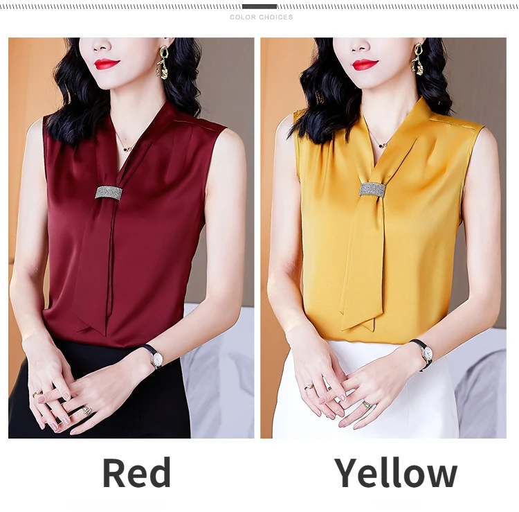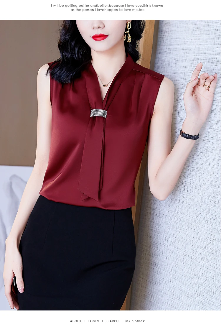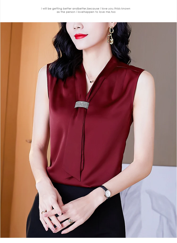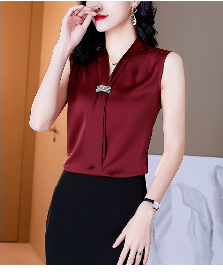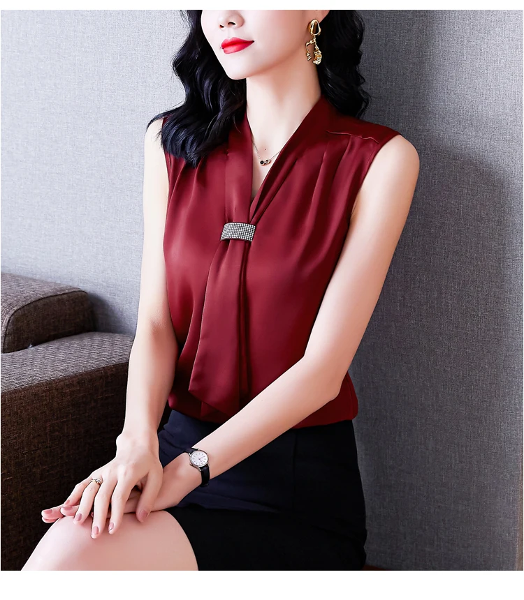 2022 Fashion Summer Satin Blouse V-Neck Sleeveless Womens Tops and Blouses Diamonds OL Women Clothing Chiffon Solid Ladies Tops