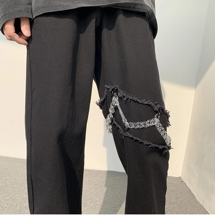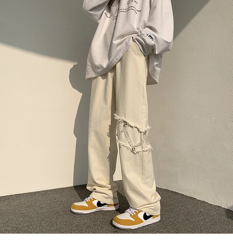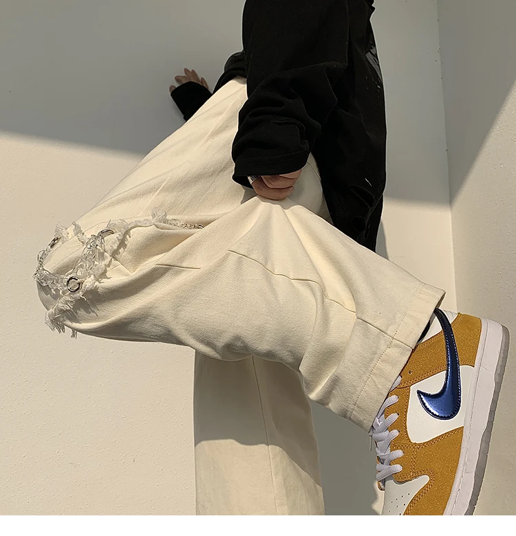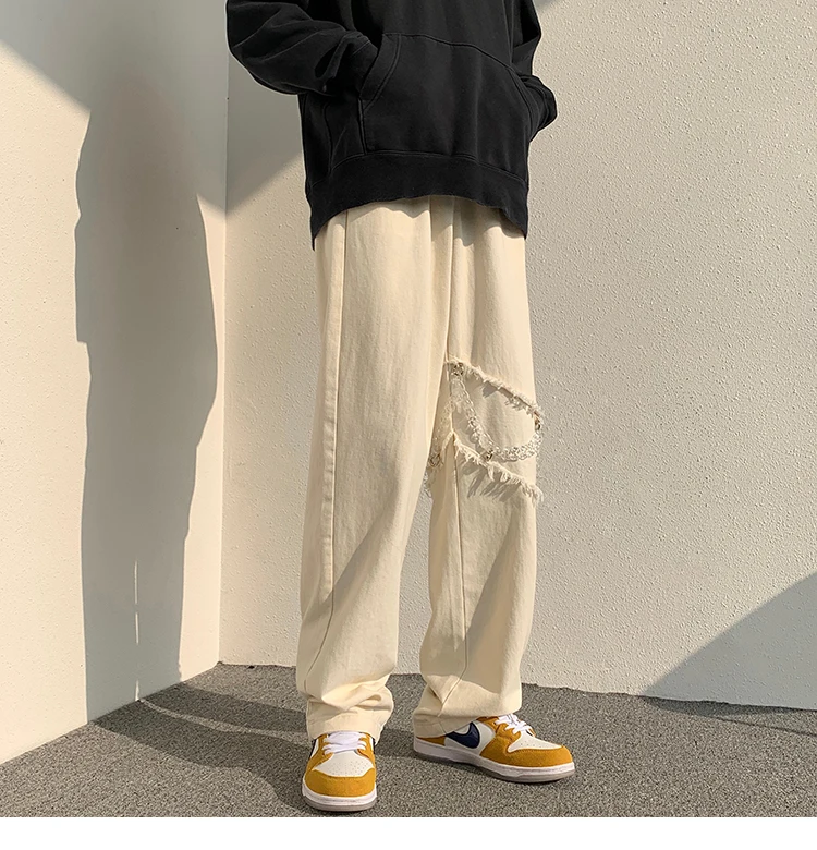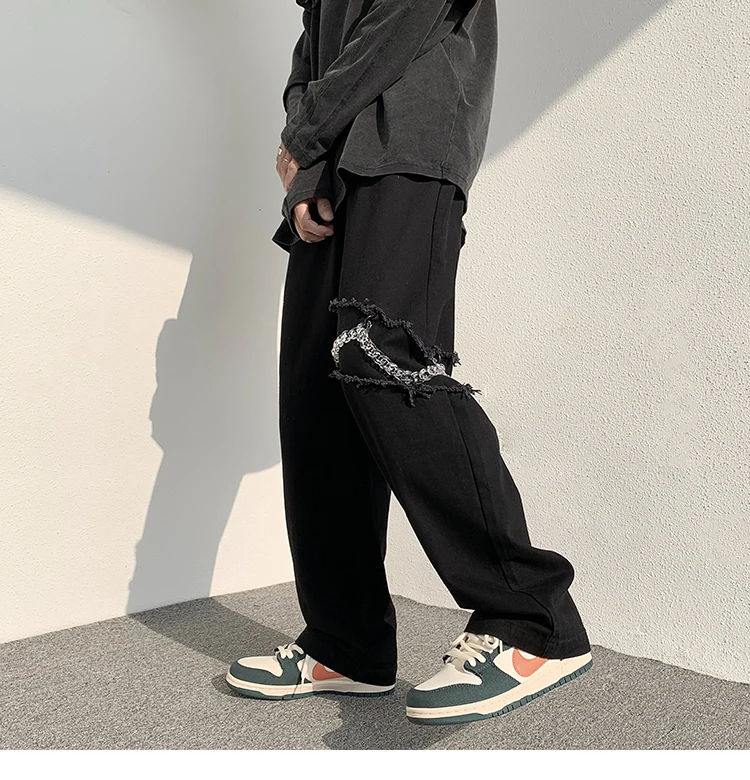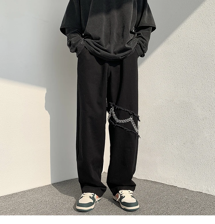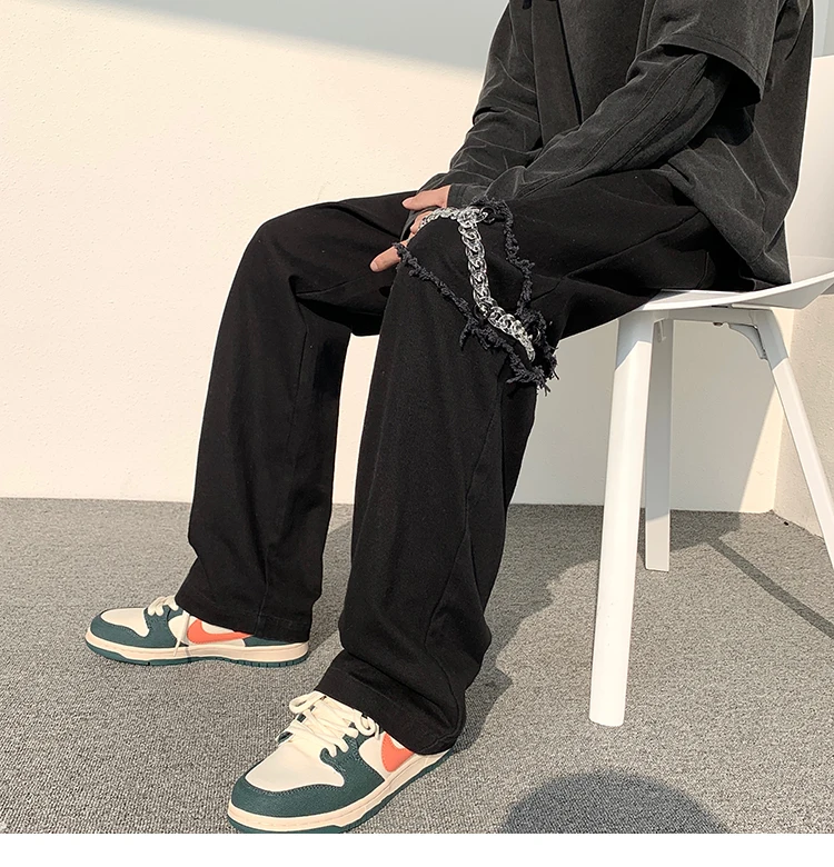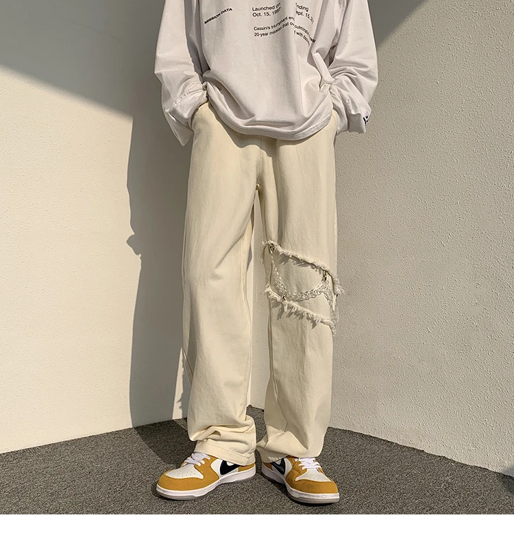 2022 New Fashion Casual Ripped Pants Spring Men's Straight Wide-leg Pants Chain Decor Washed Cotton Long Trousers Apricot/Black