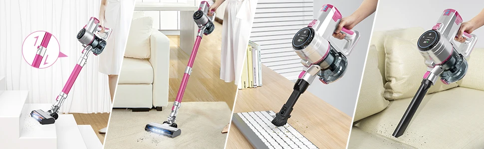 �� 【Touch display and Intelligent clogging alarm】 In addition to the suction adjustment button, the LED screen also has: battery indicator, overtemperature protection, tangled brush roller, blocking warning etc, so that the vacuum cleaner wireless is effectively protected.