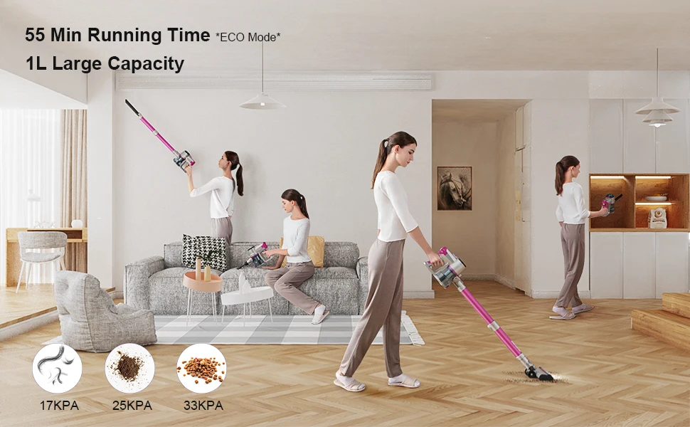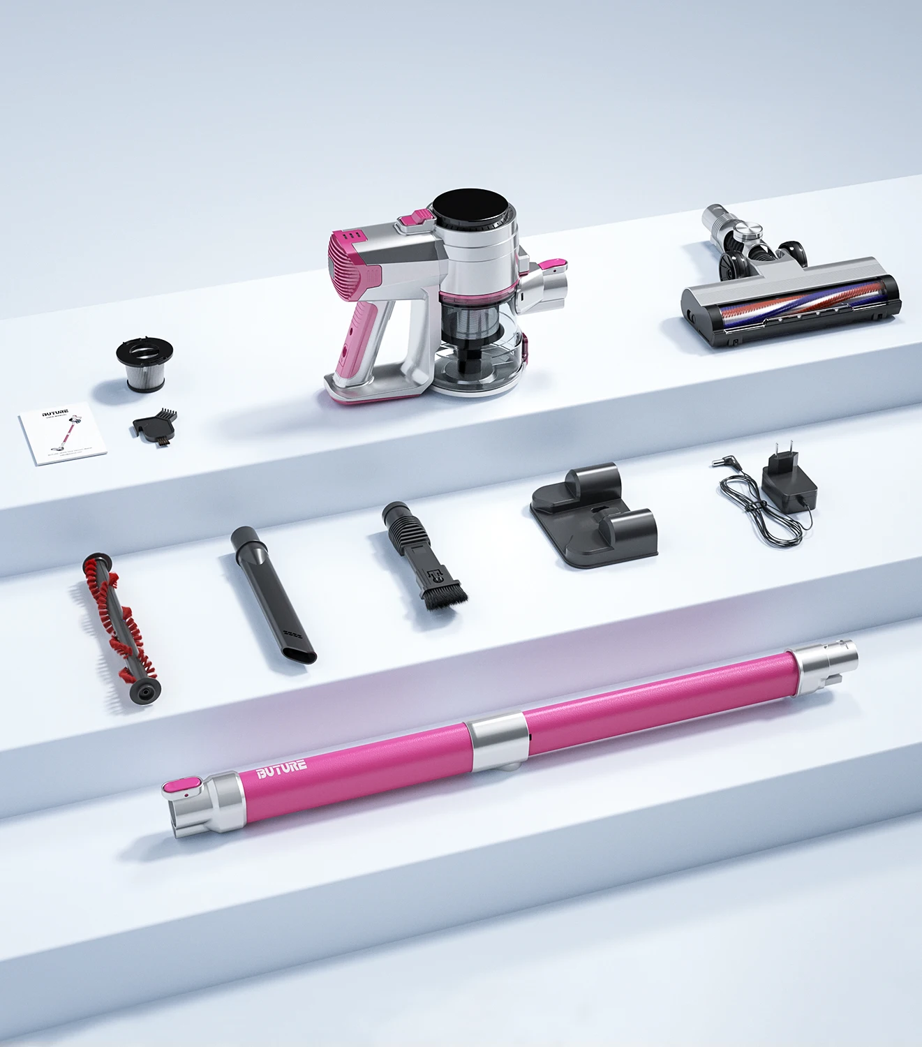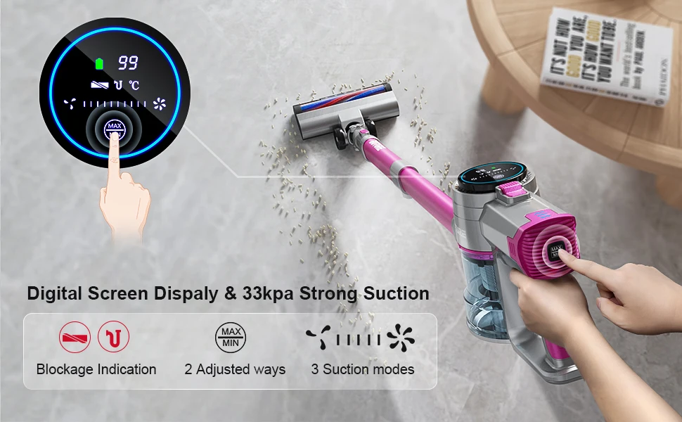 �� 【400W & 33Kpa power】 400W high performance integrated brushless motor, the BuTure cordless vacuum cleaner can reach up to 33Kpa suction power. The power can be adjusted directly on the touch screen: 33-25-17Kpa. Powerful suction allows for quick cleaning of dust, pet hair, dog food, etc.
