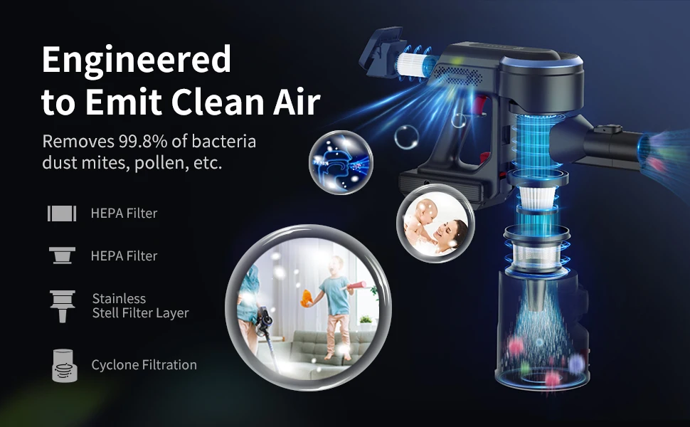 ��【1.2L Large Dust Cup】The HONITURE Powerful Stick Vacuum features an unprecedented 1.2L large capacity dust cup, which effectively reduces emptying frequency and reduces interruptions. Thanks to a 5-layer cyclonic filtration system, the waste is efficiently separated and concentrated in the tank.