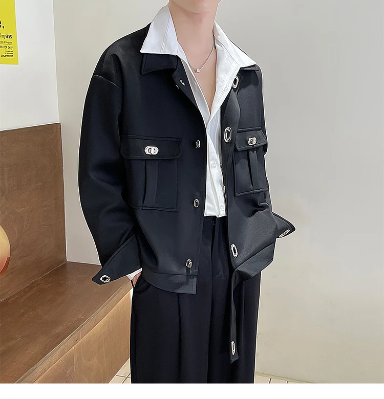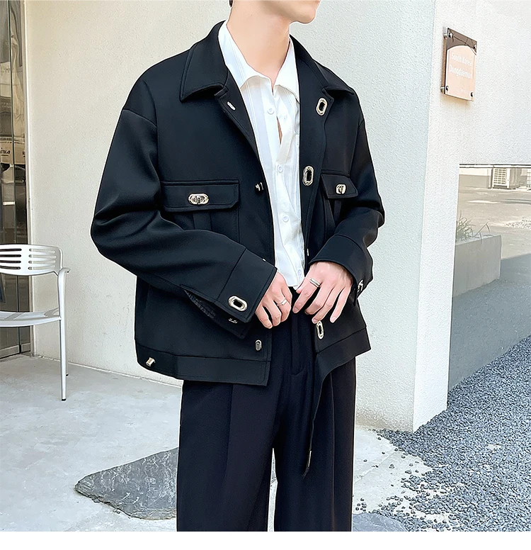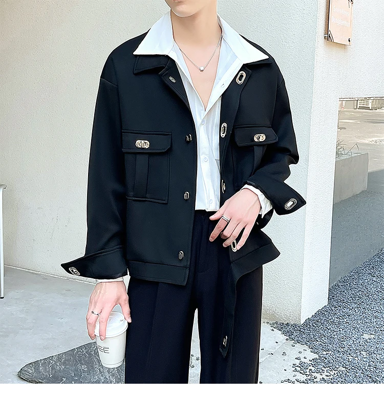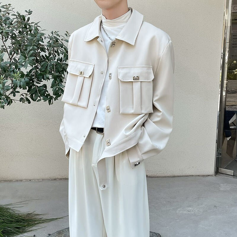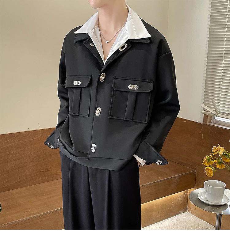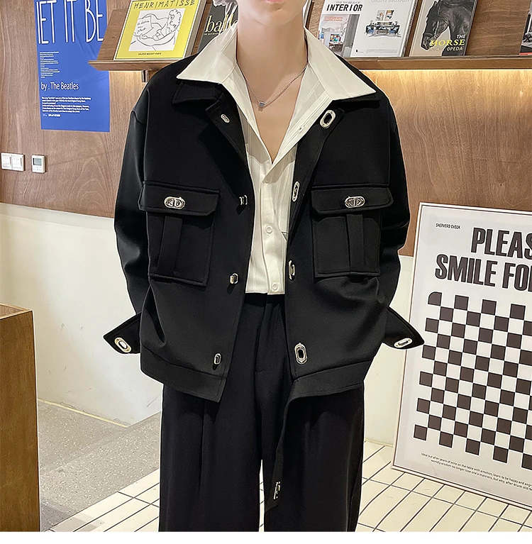 Autumn Short Jacket Men Fashion Casual Pocket Jacket Men Korean Style Loose Apricot/Black Lapel Jacket Mens Short Coat M-2XL