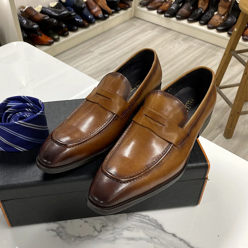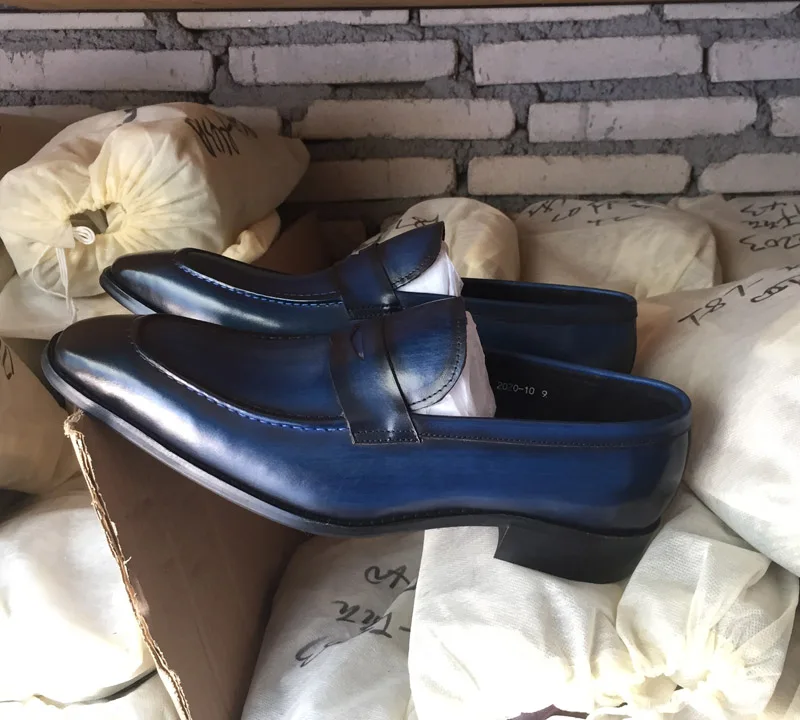 Size 8-15 Men's Penny Loafers Genuine Leather Blue Brown Business Dress Shoes for Men Quality Hand Painted Slip On Male Footwear