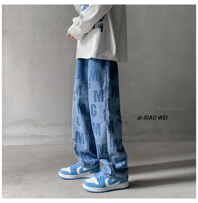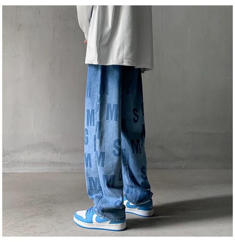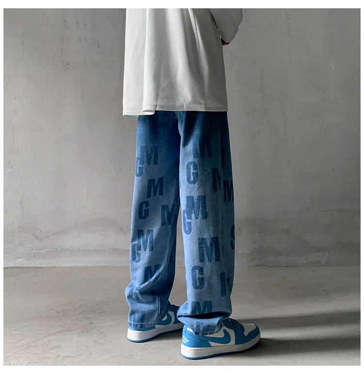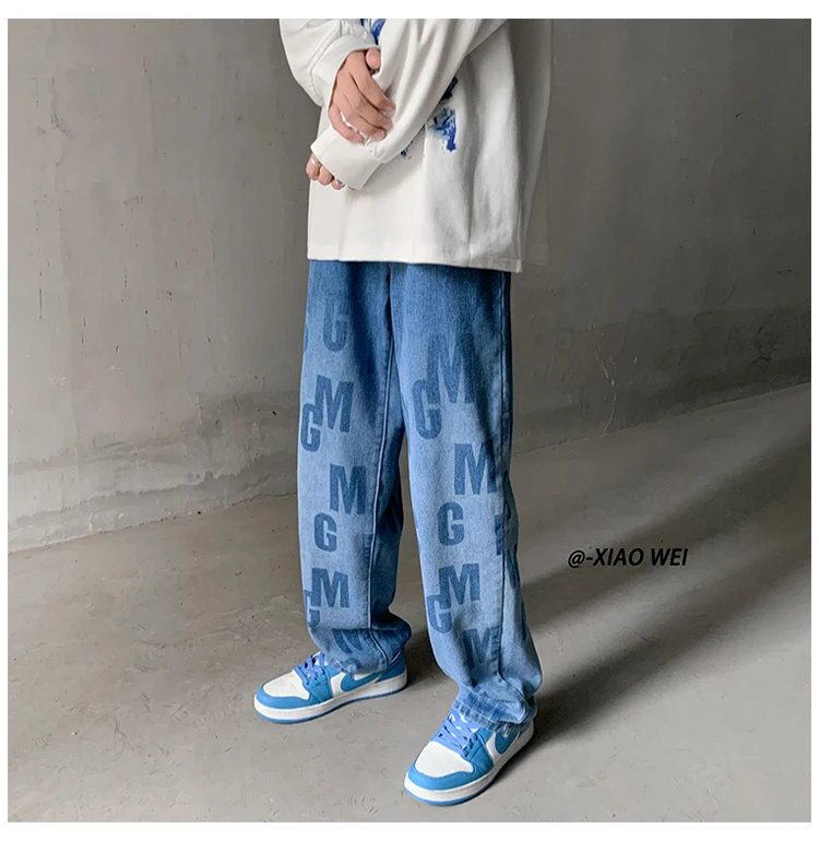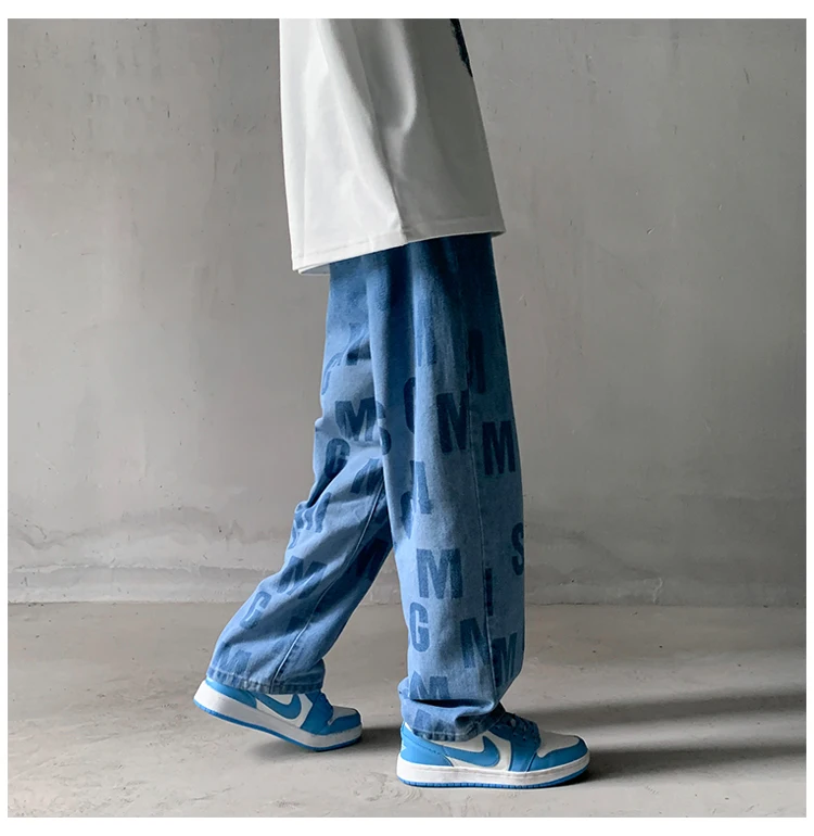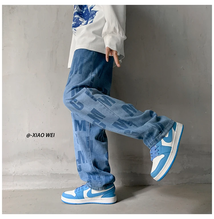 Black/Blue Men Streetwear Casual Letter Printed Jeans Autumn New Loose Straight Denim Pants Harajuku Male Jean Pants Trousers