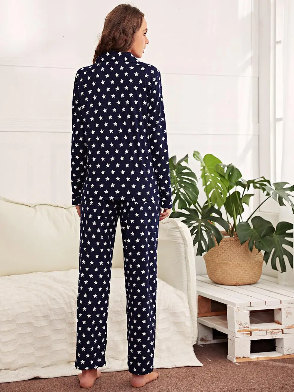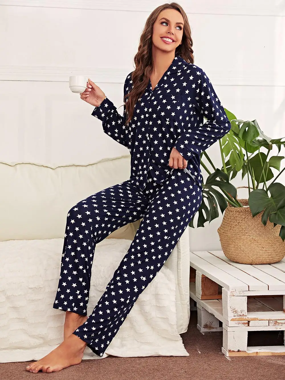 European and American pajamas female autumn and winter star NNS81-Navy print cardigan long-sleeved home clothes suit