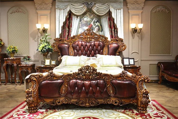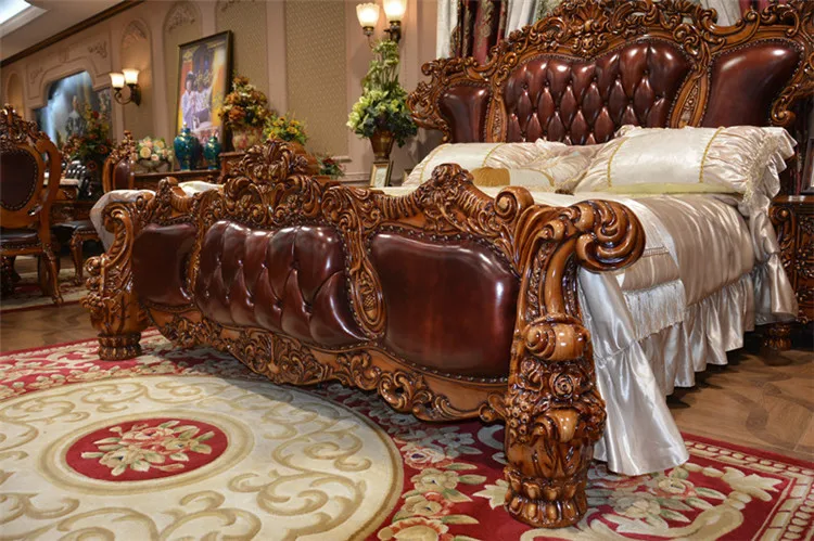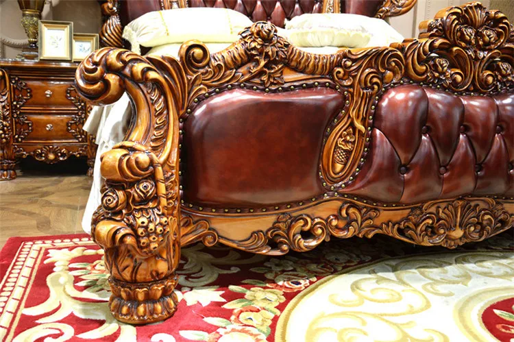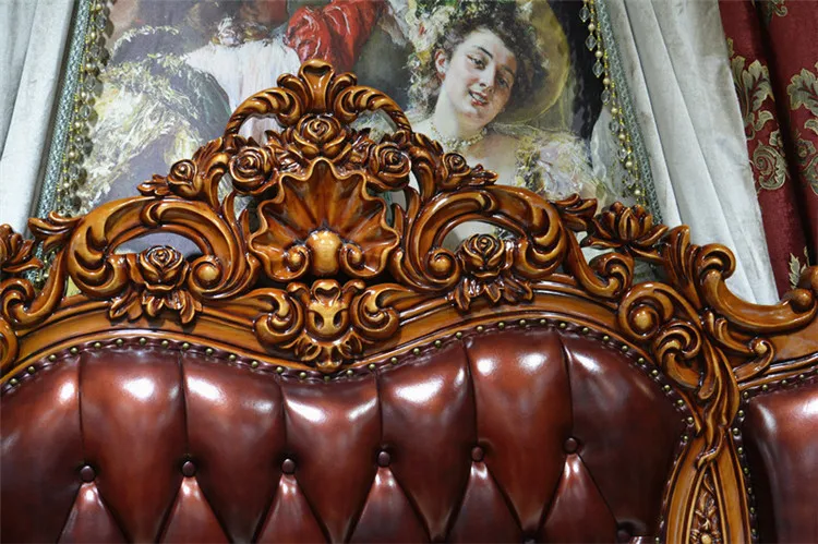 European Luxury Leather Bed 1.8m Double Bed American Villa Solid Wood Carved Living Room Leather Art Wedding Bed