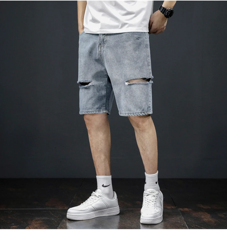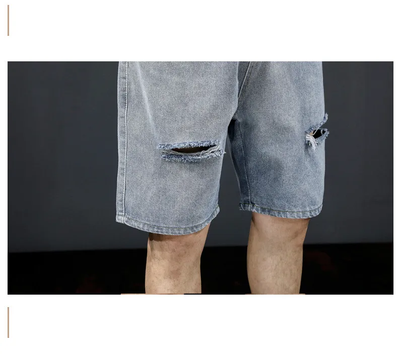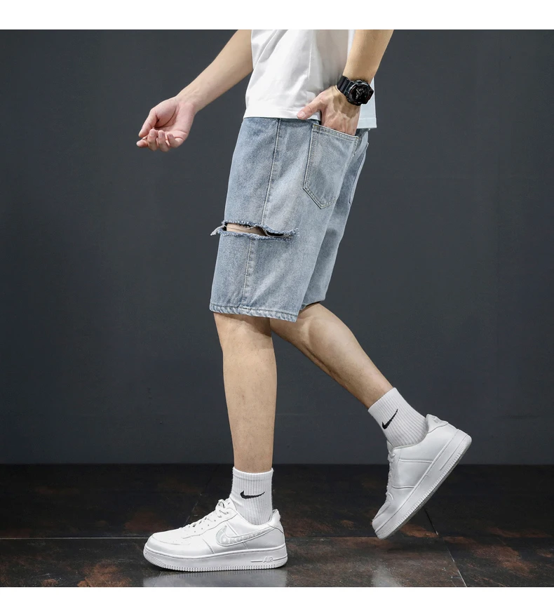 Fashionable Holed Men's Denim Shorts Street Hip-hop Knife Cut Straight Leg Five-piece Pants Versatile Light Color Pants