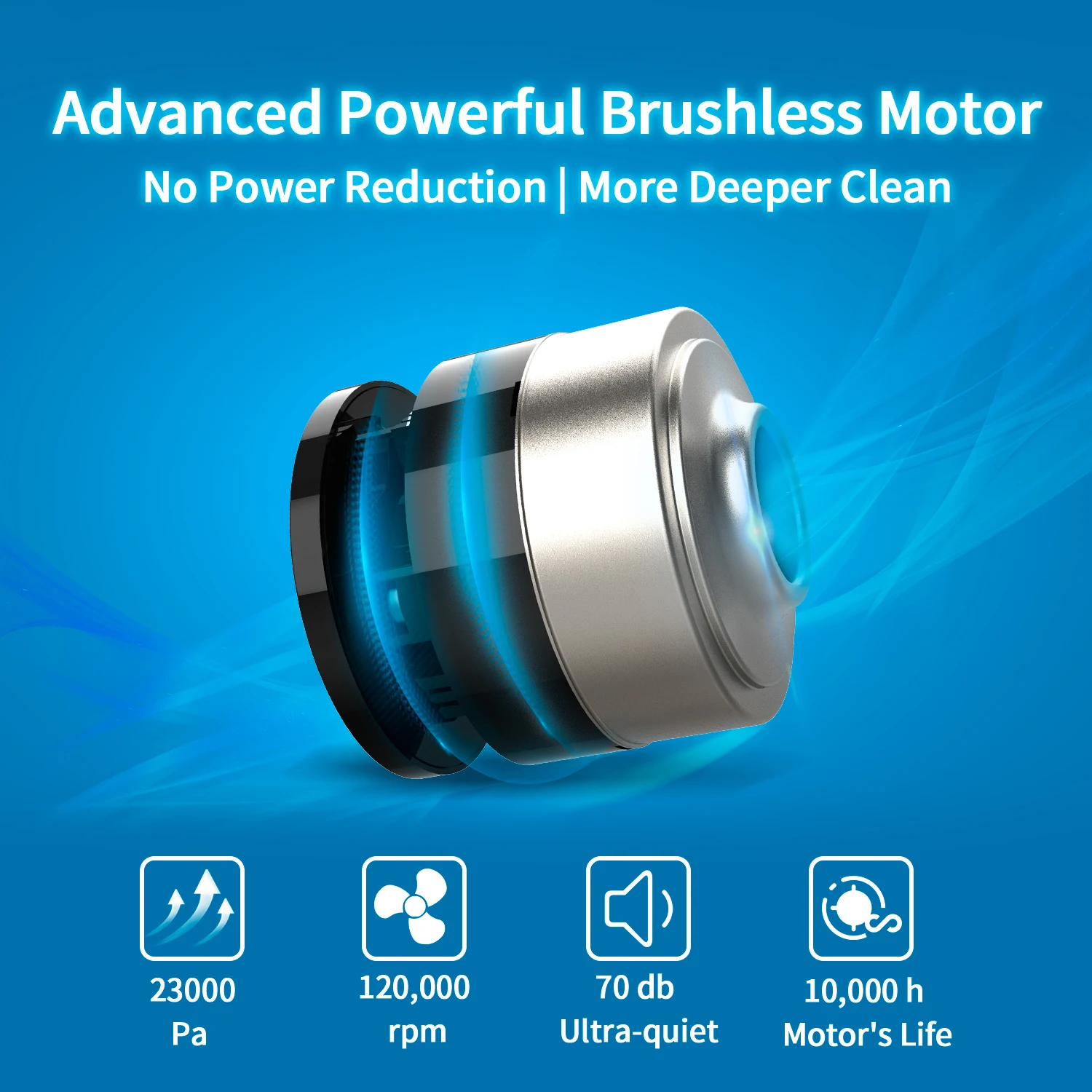 Brushless Motor & Powerful Suction】The cordless vacuum features 250W advanced brushless digital motor with over 120,000rpm, 120 AW suction power and 23K PA suction force on MAX mode, picks up pet hair, debris, from variety of surfaces including hardwood floor, low and med pile carpet, tile floor, marble floor etc. Peacefully cleaning with less disturbance to your families and pets.