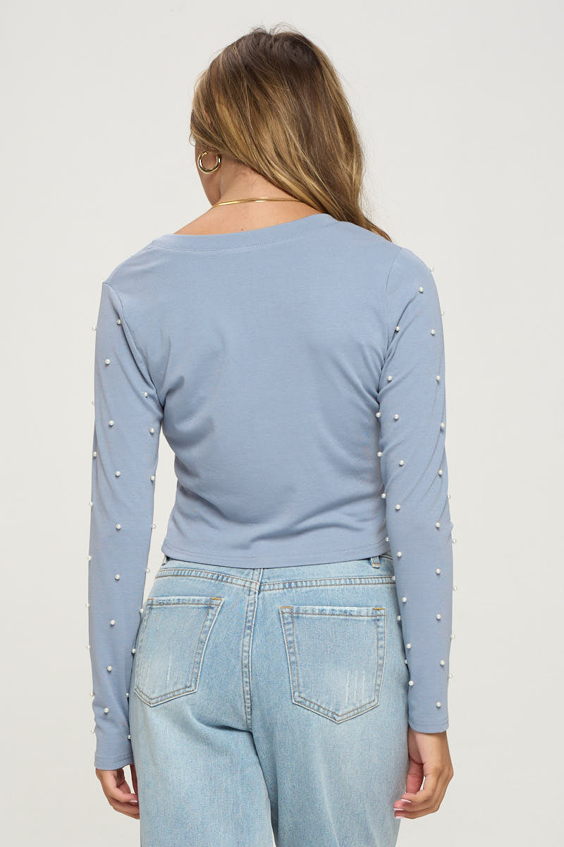 A two-piece solid knit top set featuring a tank top with a cropped length, spaghetti straps, and a scoop neckline match with cardigan top with faux pearl details, long sleeves, button-front closure, v neckline, and a cropped length.