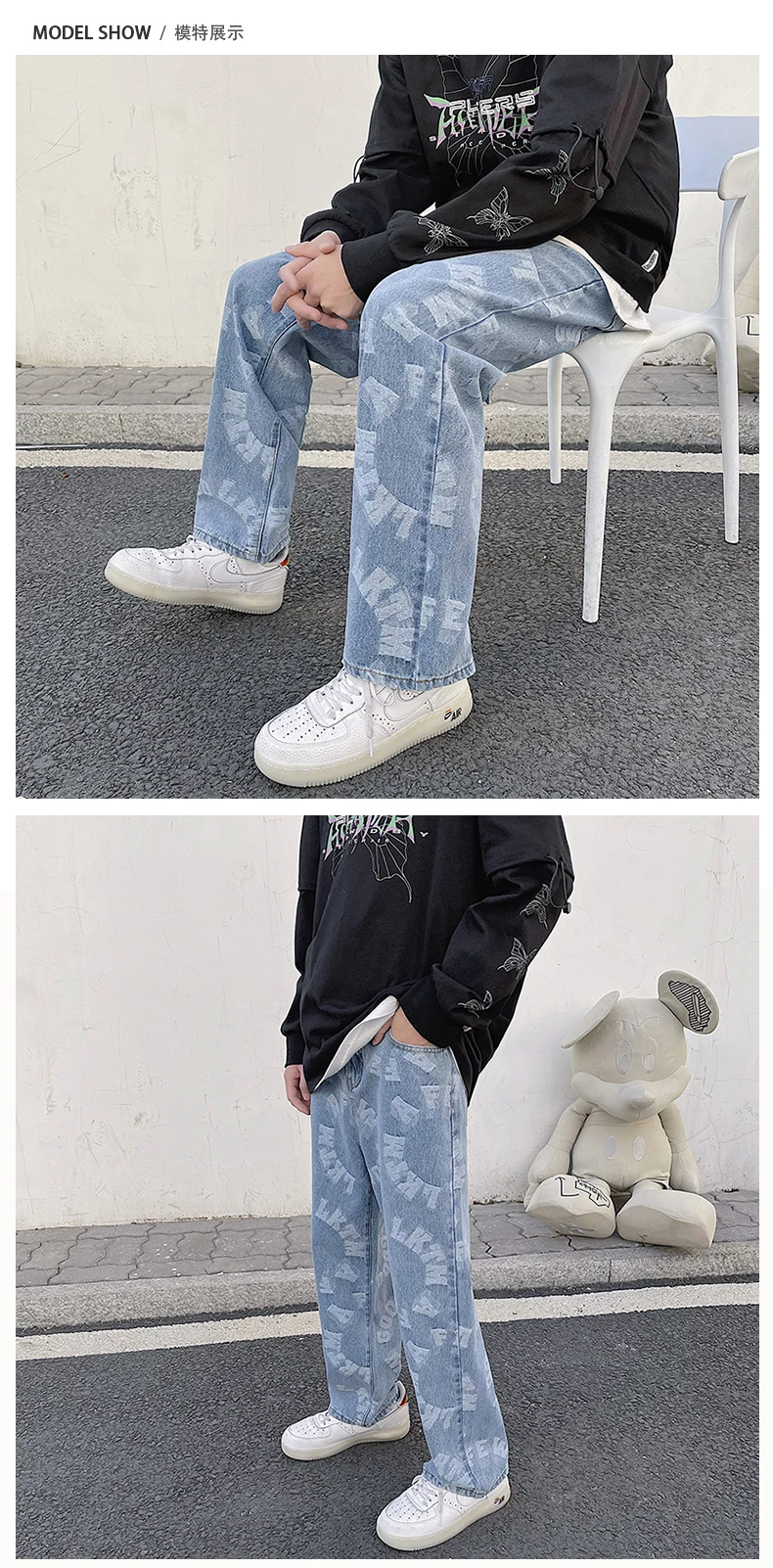 Jacquard Jeans Blue Mens Loose Straight Leg Long Pants Streetwear Baggy Denim Clothing Graphic Streetwear Baggy