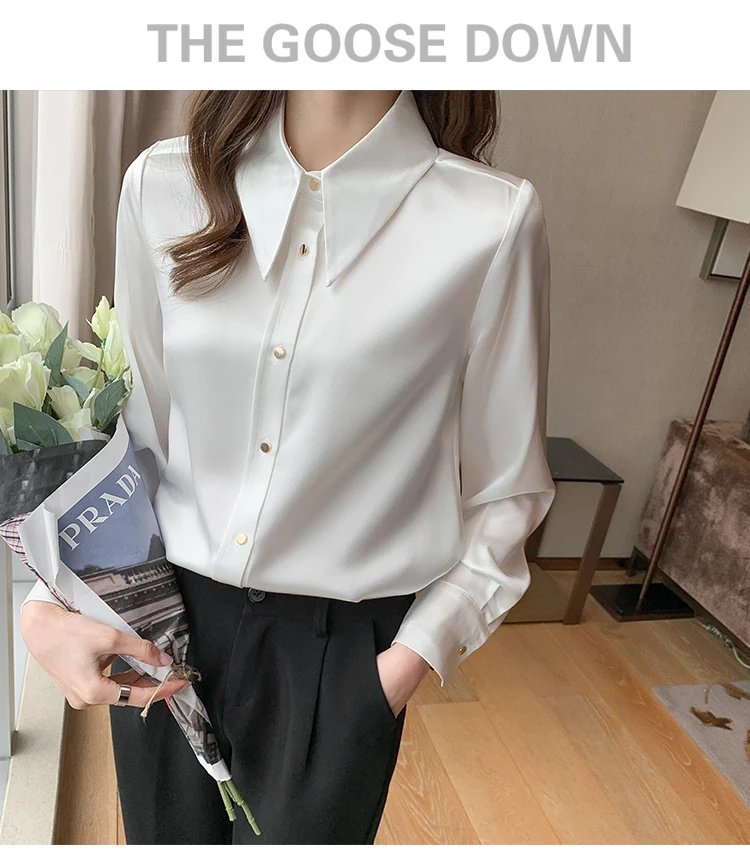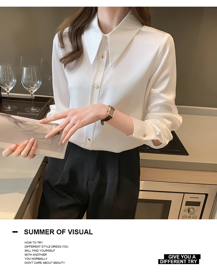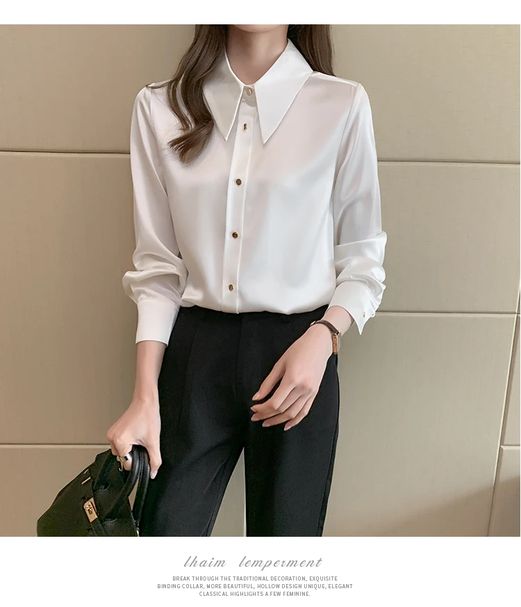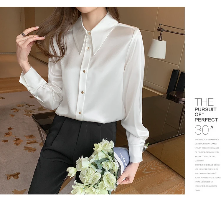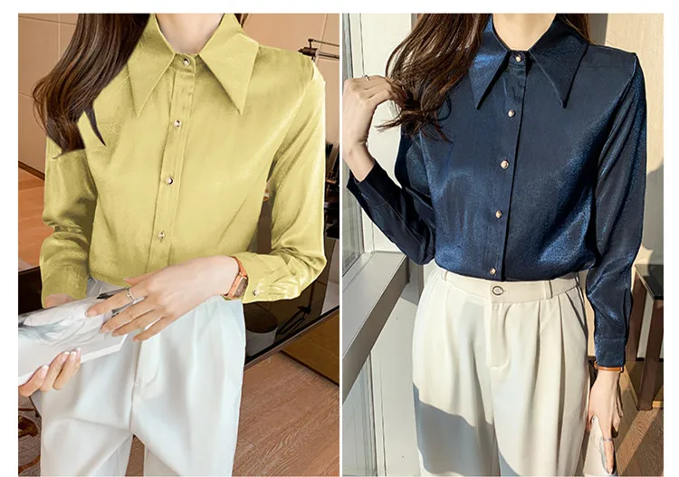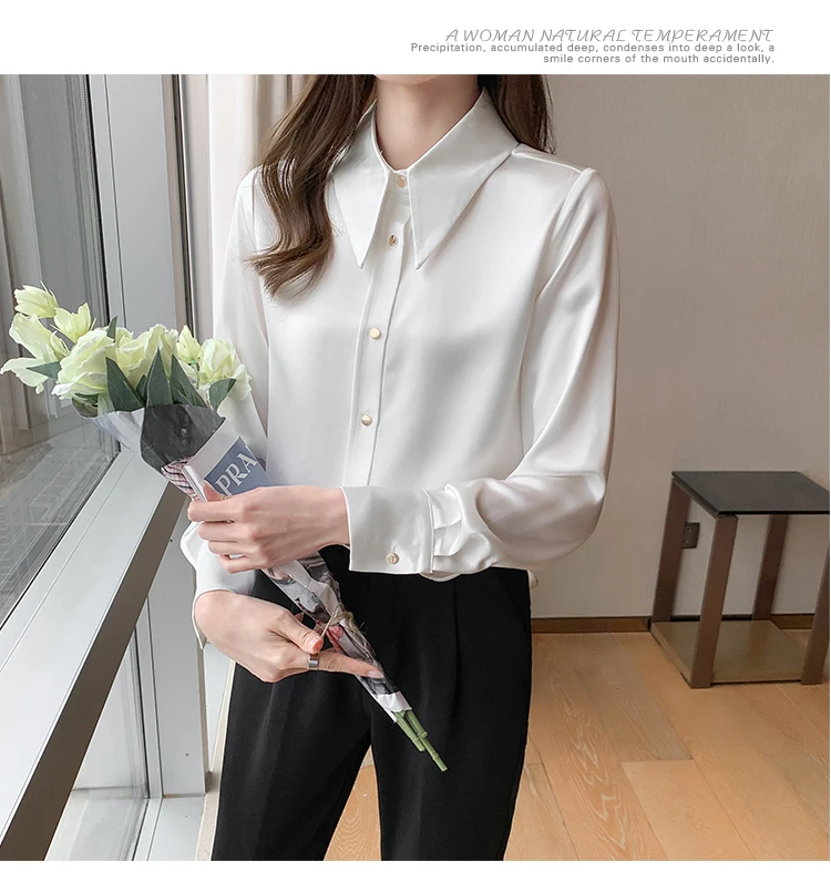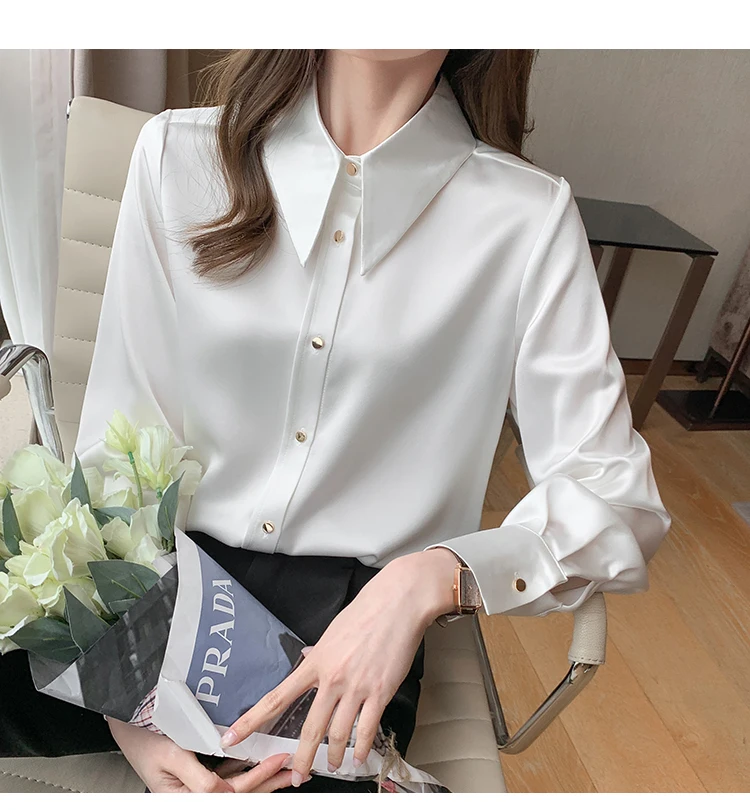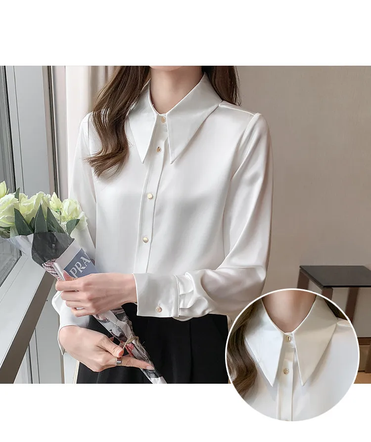 Korean Silk Women Shirts Satin Blouses Women Long Sleeve Shirts Tops Woman Silk Shirt Tops Woman Peter Pan Collar Satin Blouses