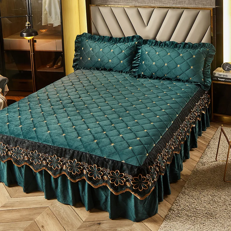 Luxury Embroidery Bedspread Thicken Plush Quilted Bed Skirt Winter Warm Soft Velvet King Size Bed Cover Not Including Pillowcase