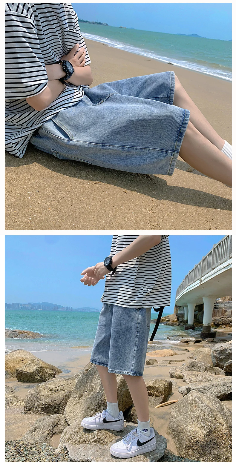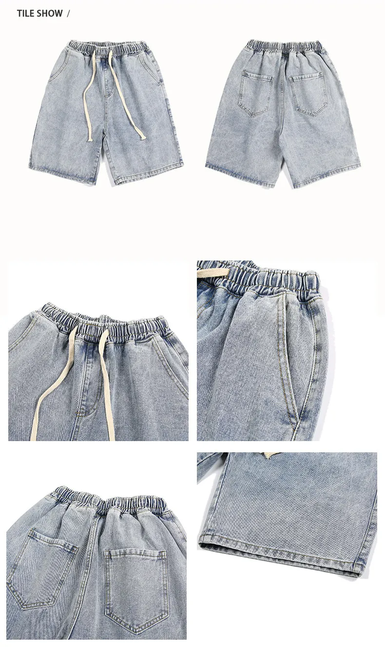 Men's Summer Denim Shorts Korean Elastic Waist Lace-up Straight Leg Pants Student Loose Casual Pants Cotton Pants