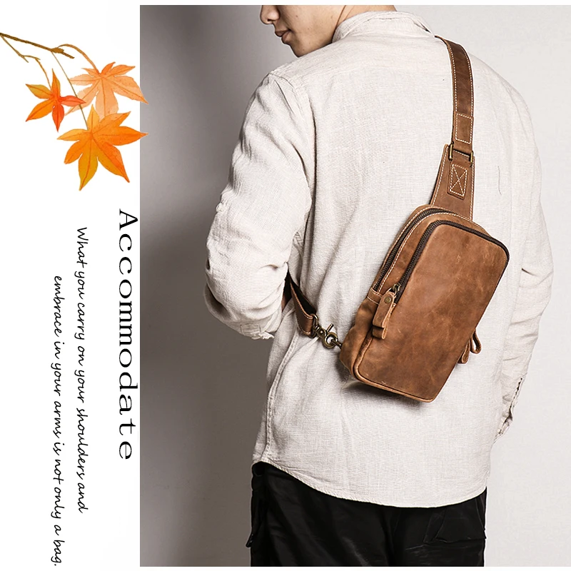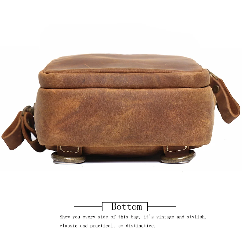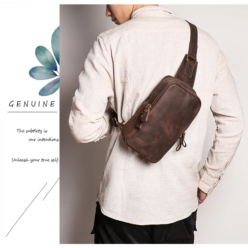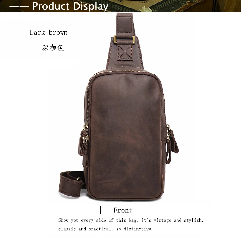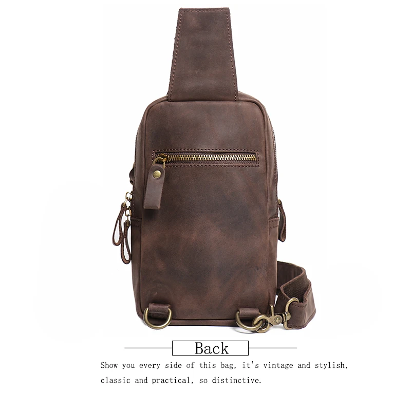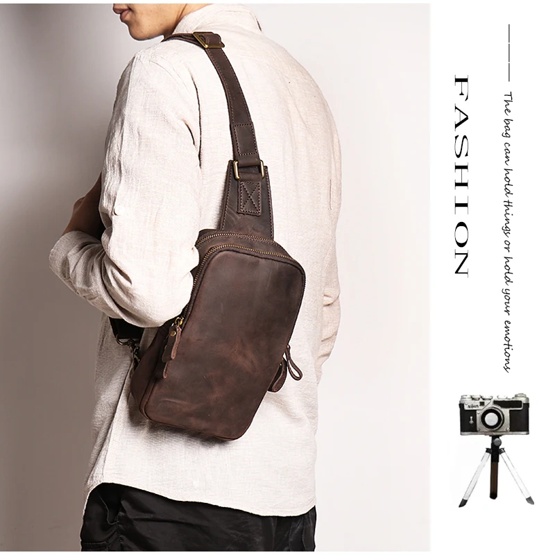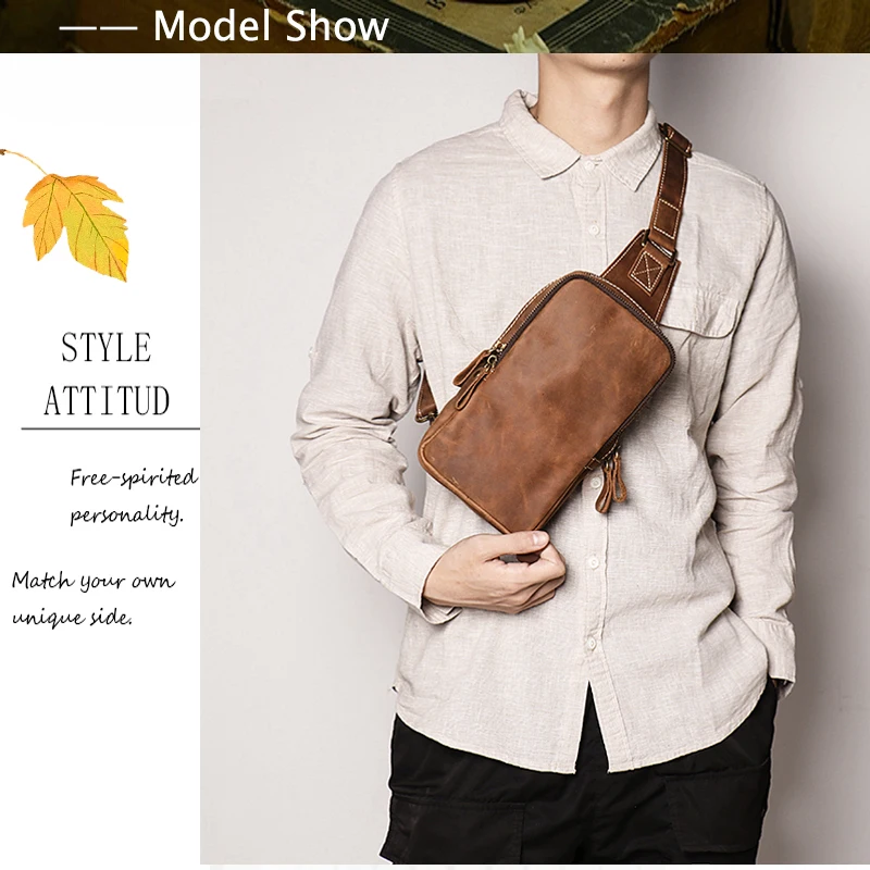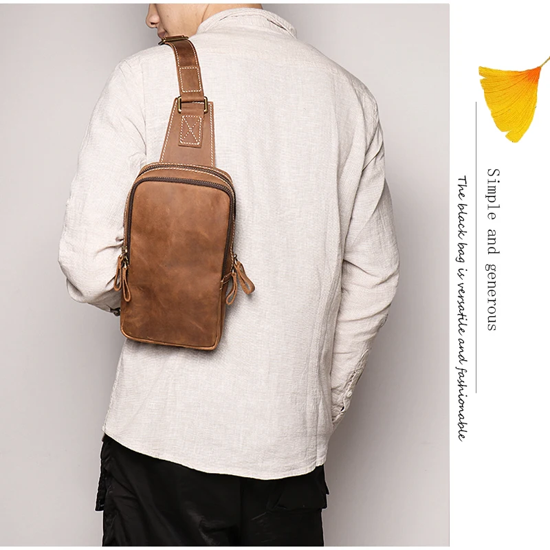 Men Crazy Horse Cow Leather Chest Bag Zipper Retro Male Motorcycle Outdoor Chest Bag Casual and Simple Single-Shoulder Bag