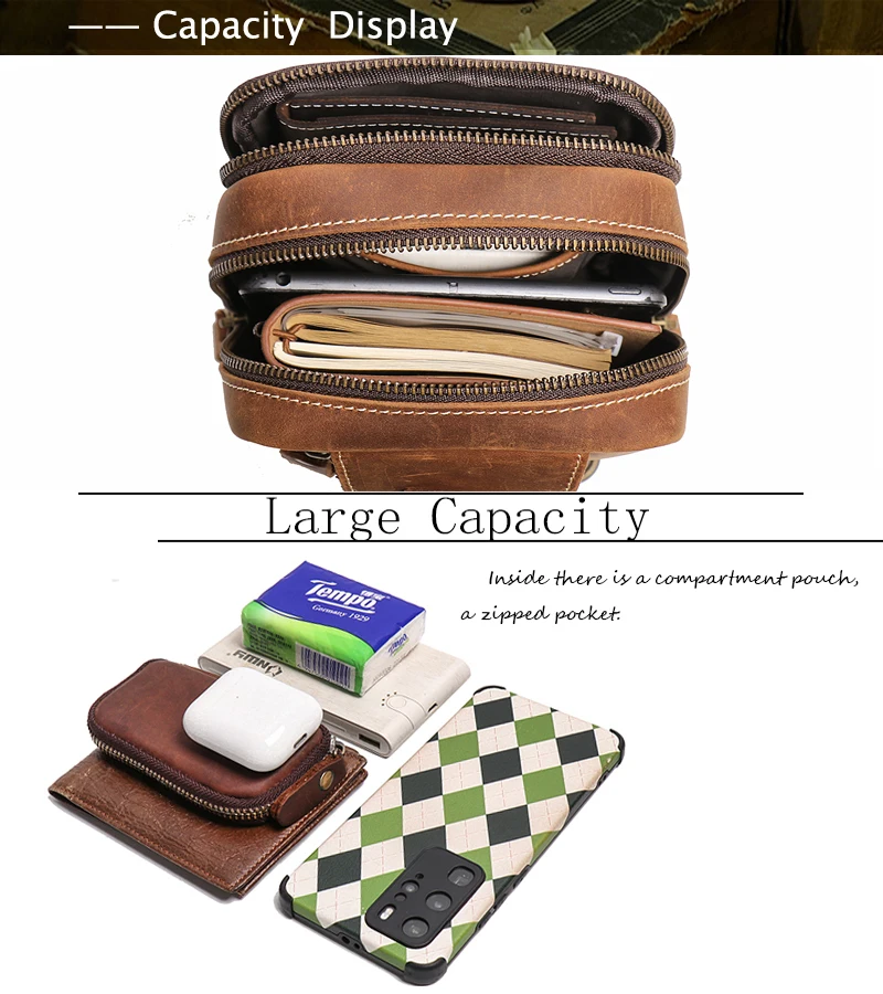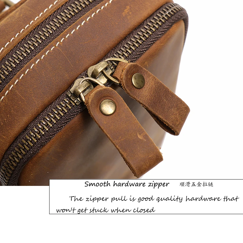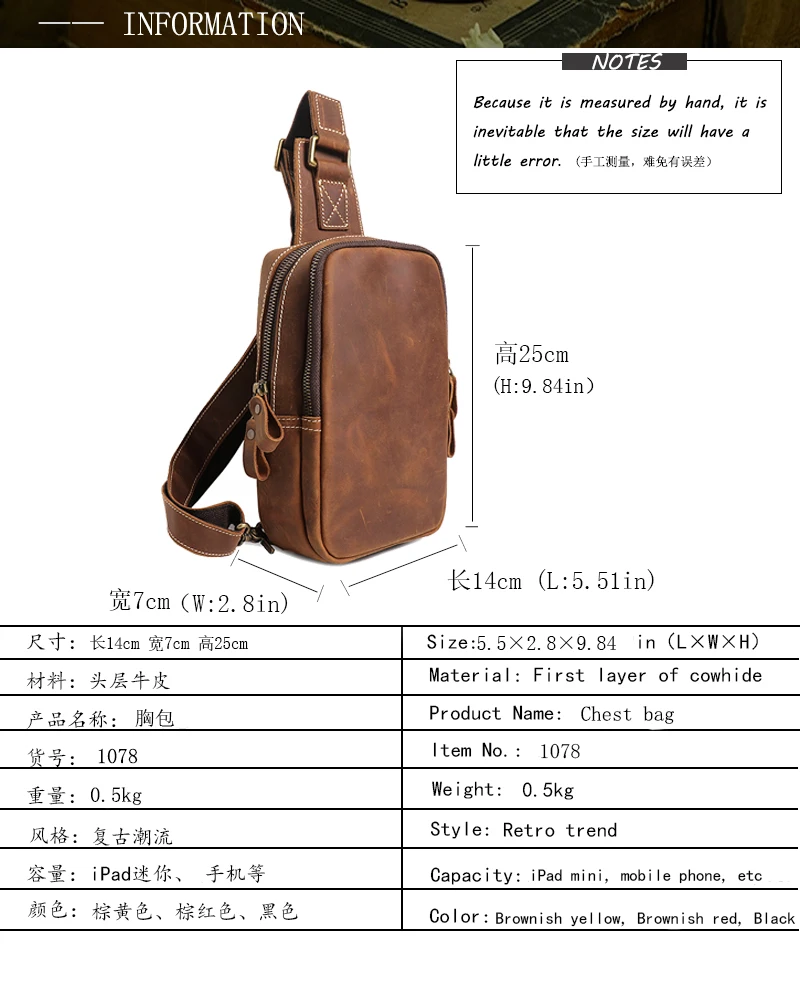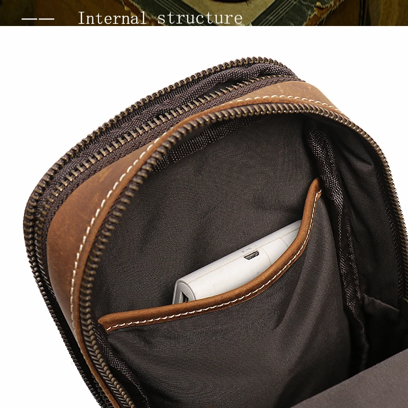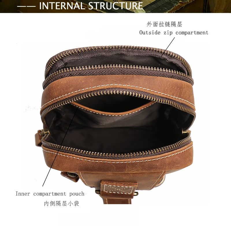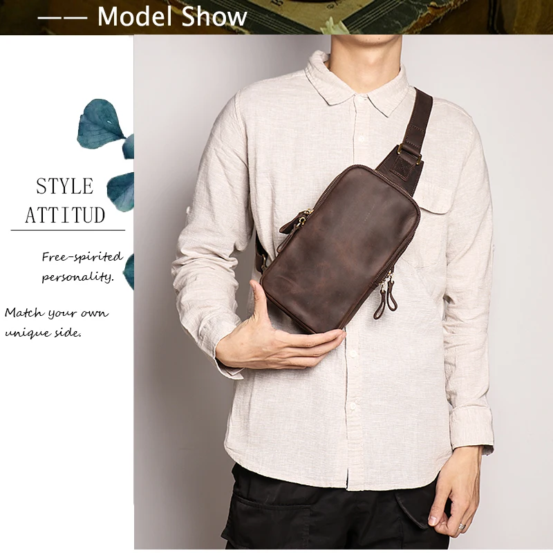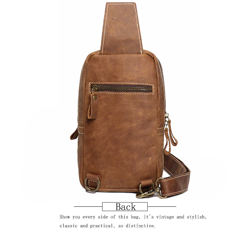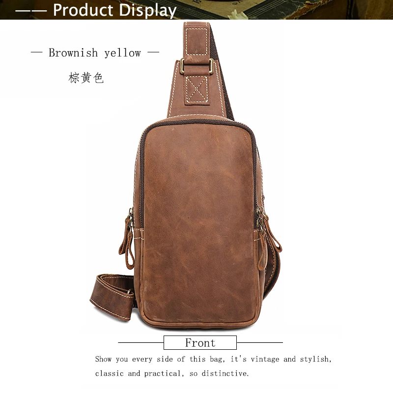 Men Crazy Horse Cow Leather Chest Bag Zipper Retro Male Motorcycle Outdoor Chest Bag Casual and Simple Single-Shoulder Bag