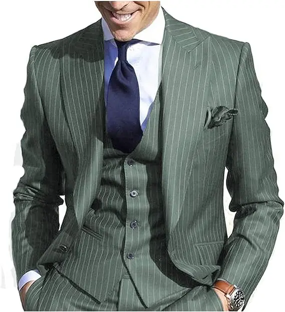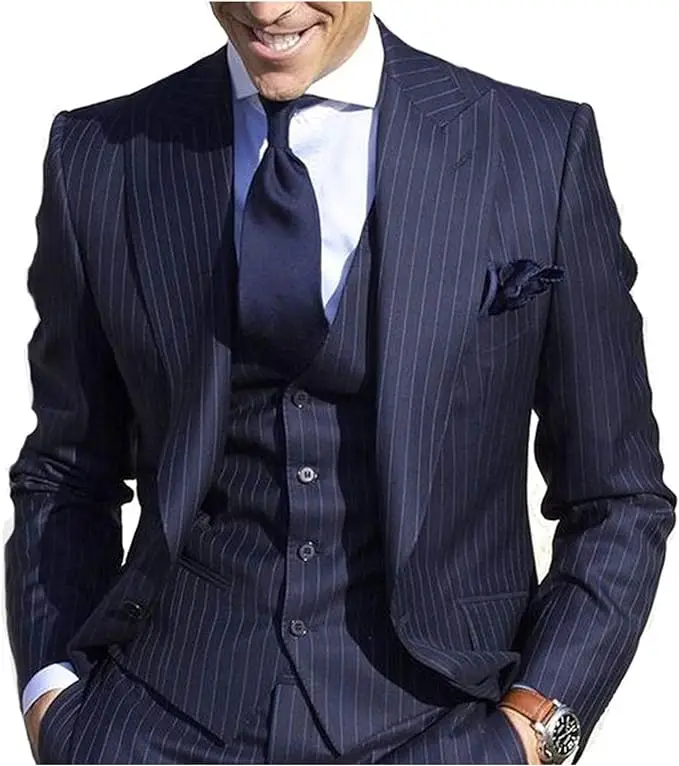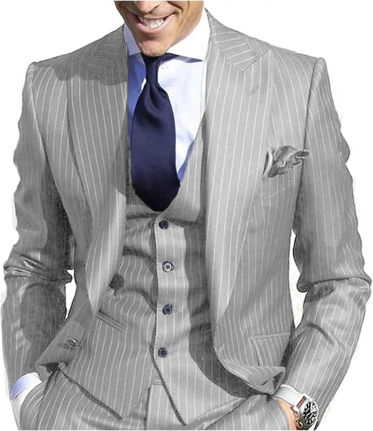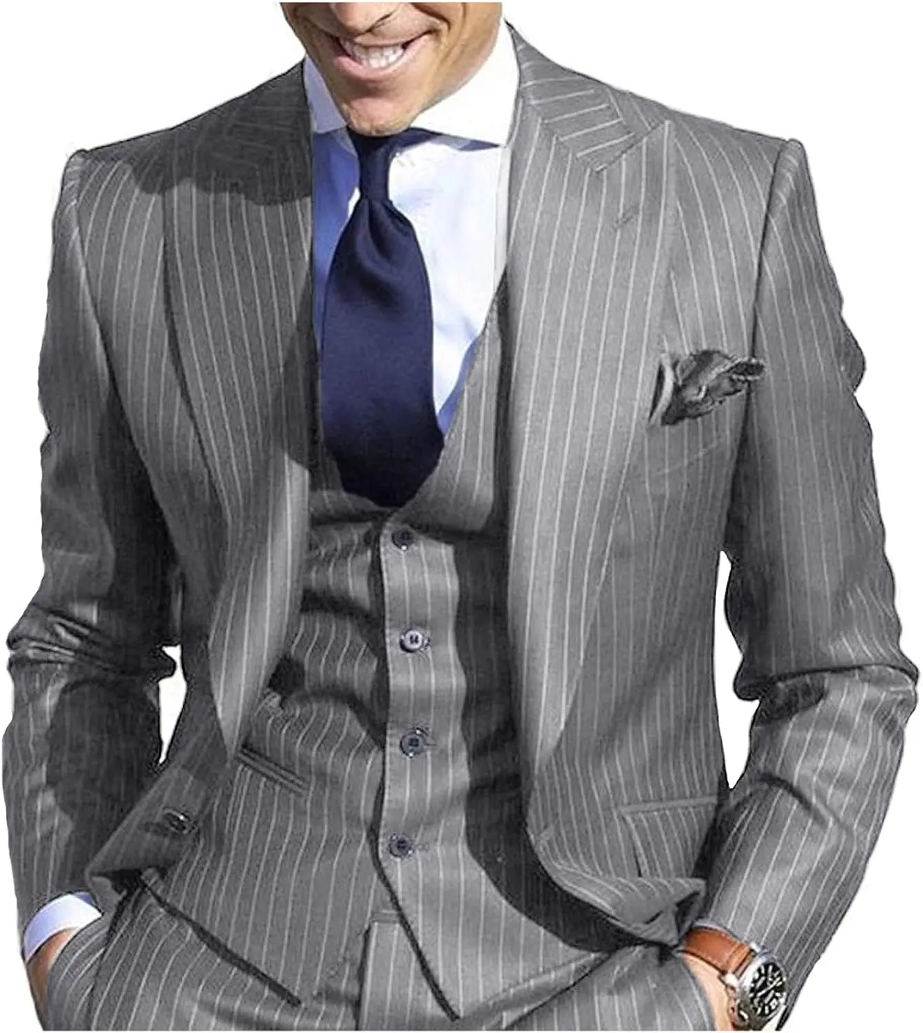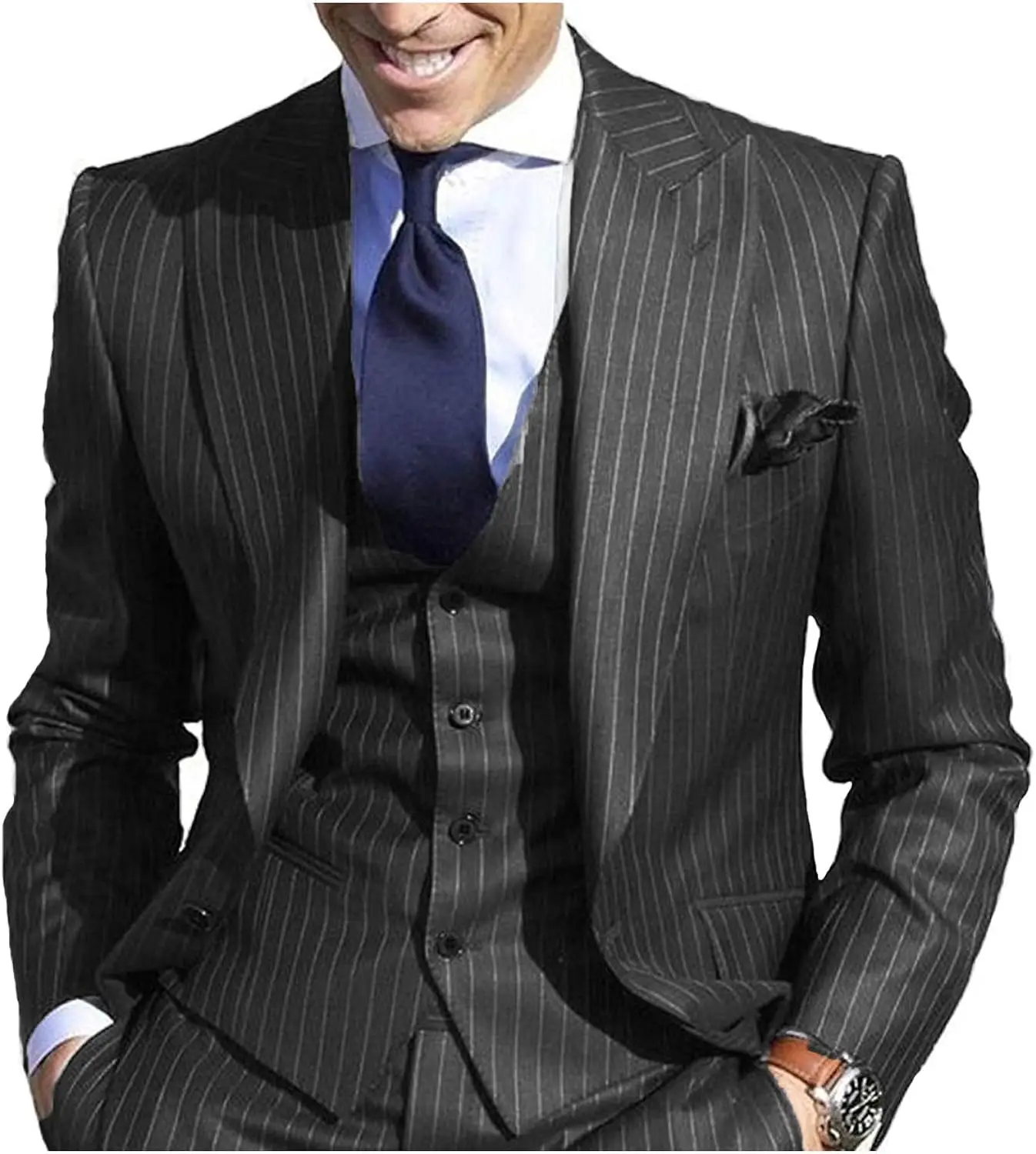 Men's Pinstripe Suit Slim Fit Stripe 3 Piece Suits Peaked Lapel Formal Wedding Business Suit Jacket Vest Pants Sets