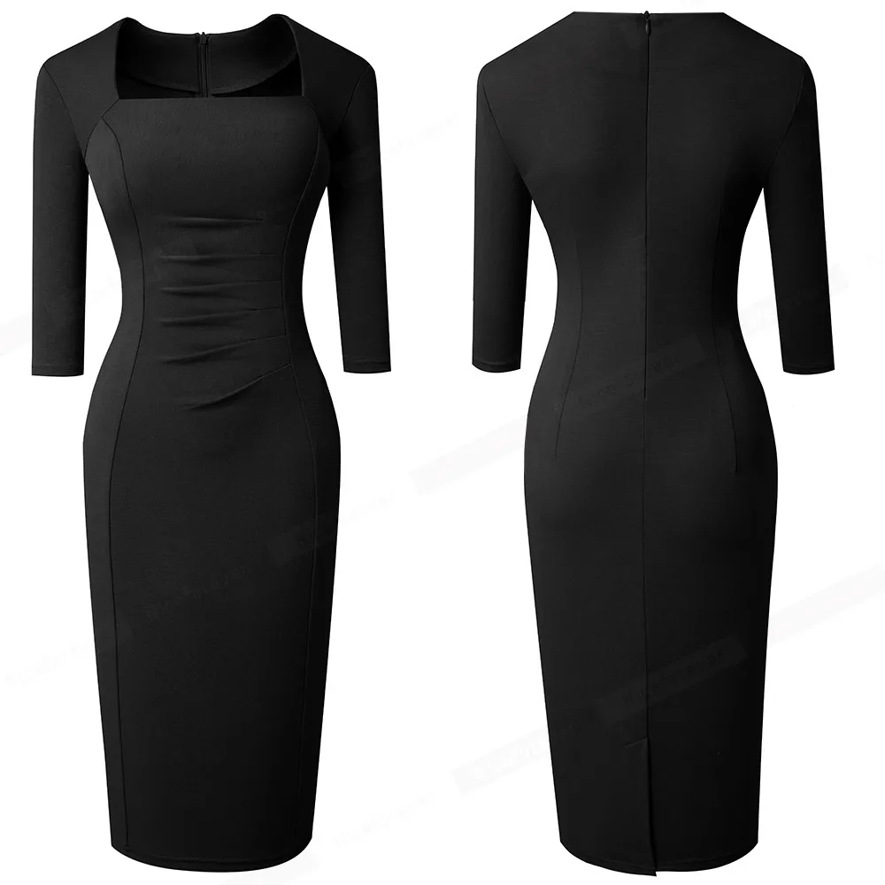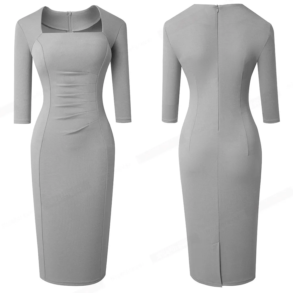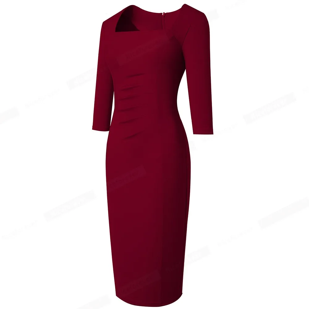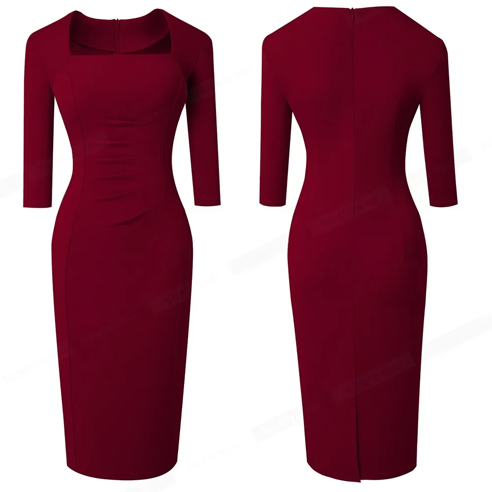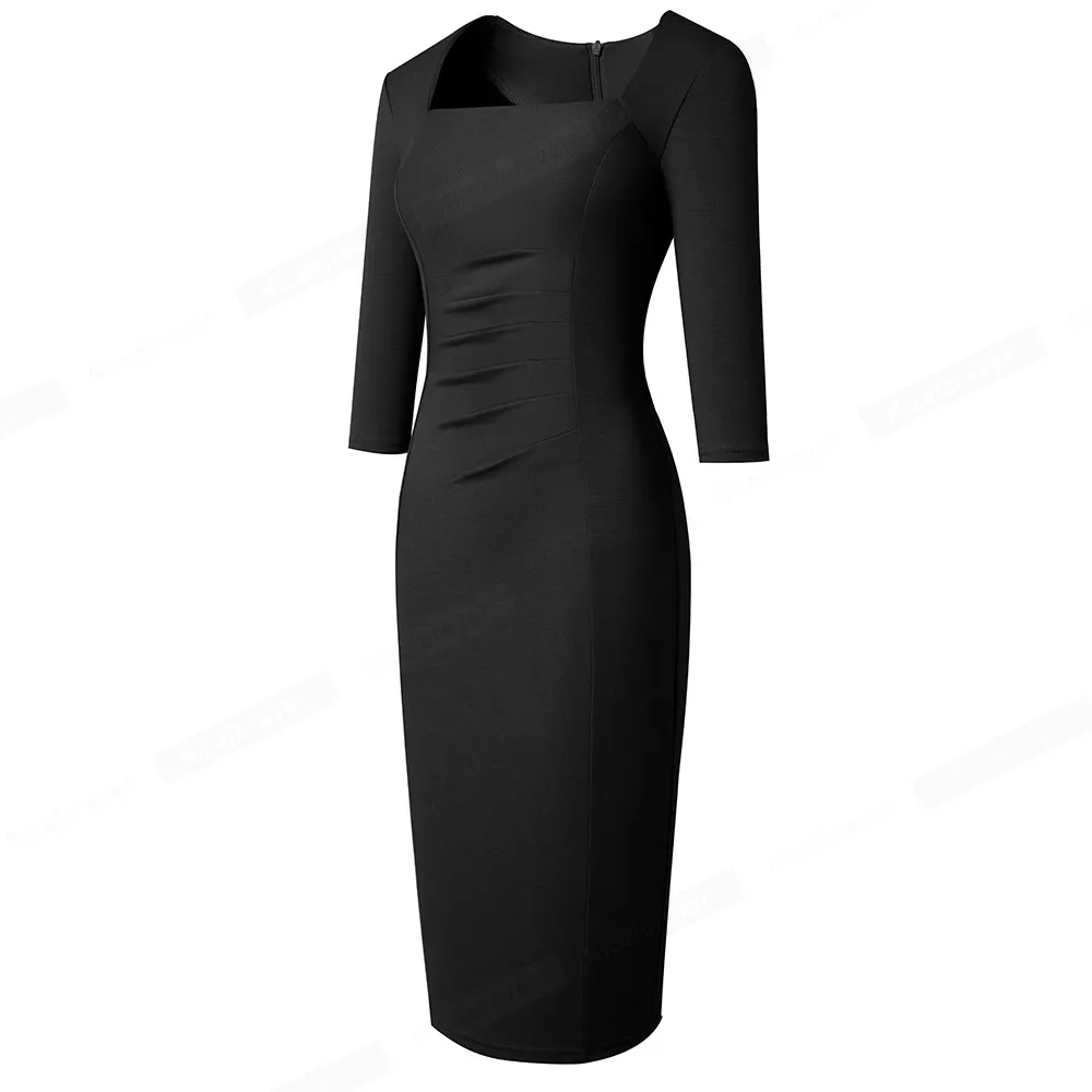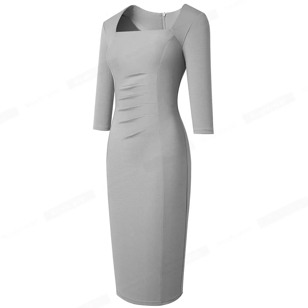 Nice-forever Spring Women Vintage Square Neck Office Dresses Business Formal Elegant Bodycon Slim Dress B688