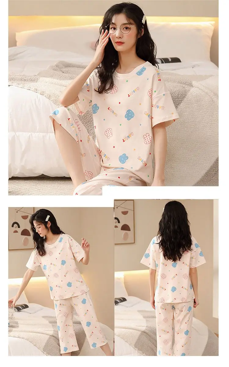 Summer Knitted Cartoon Rabbit Print Two Piece Kawaii Girl Short Sets Women Pajamas Sets Pyjamas Ladies Sleepwear Pijamas Fashion