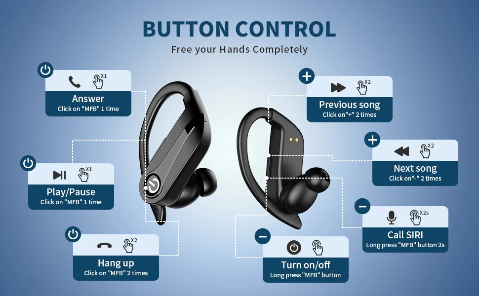 【One button control & stereo】The Bluetooth sports headphones with touch control sensors, Bluetooth earphones can be conveniently switched on and off, play/pause, skip songs, answer/hang up and adjust the volume.