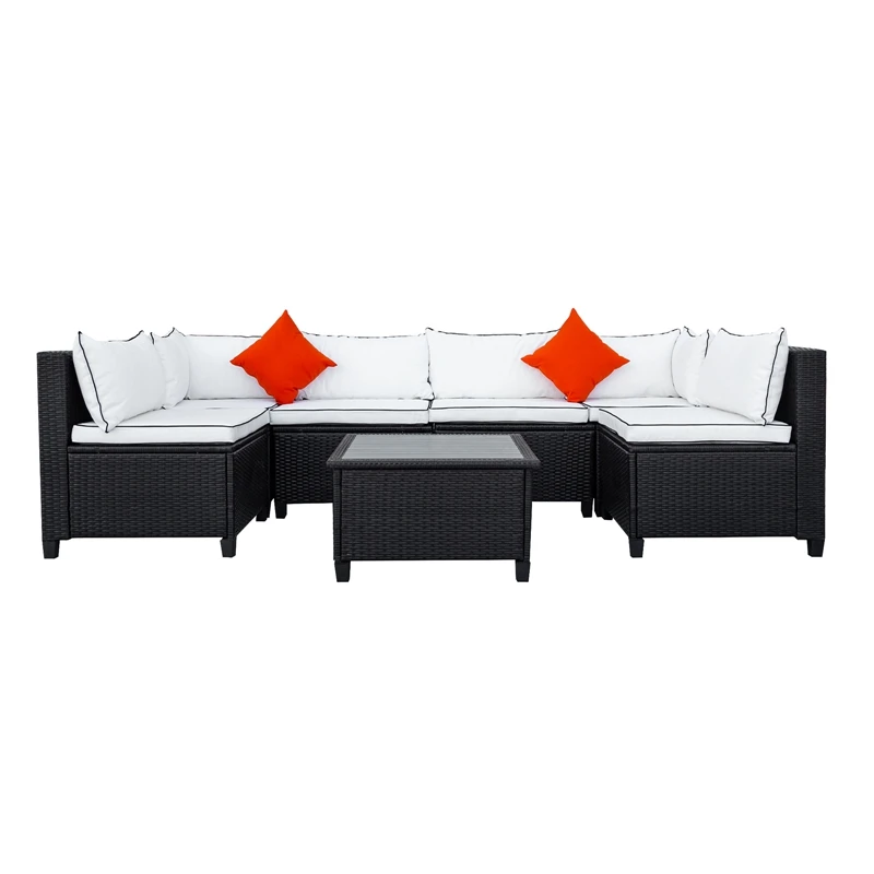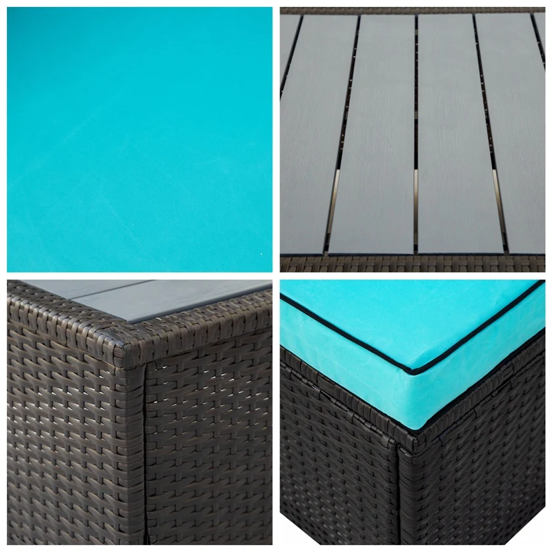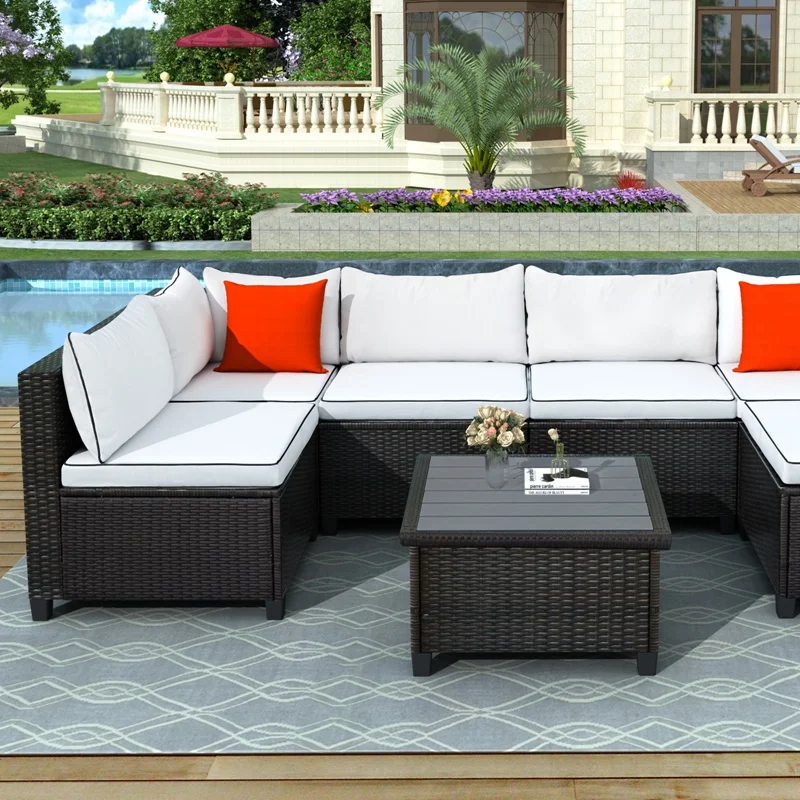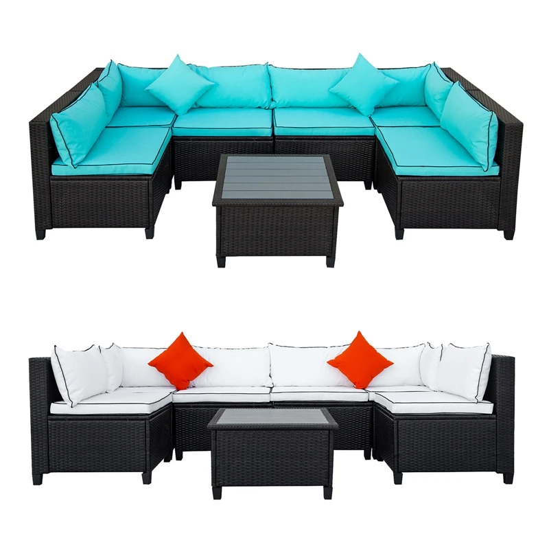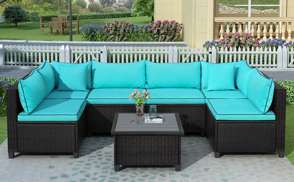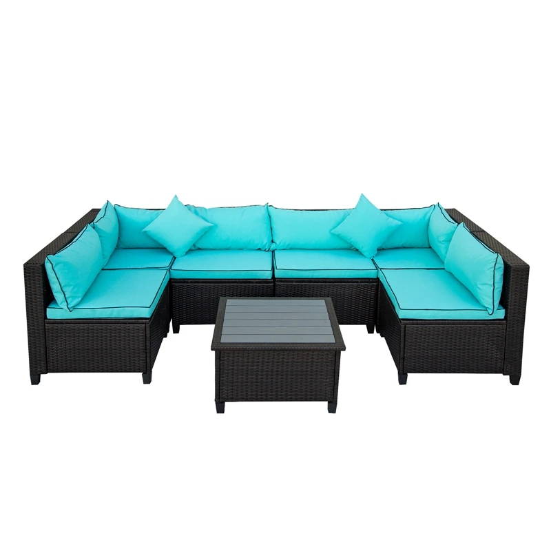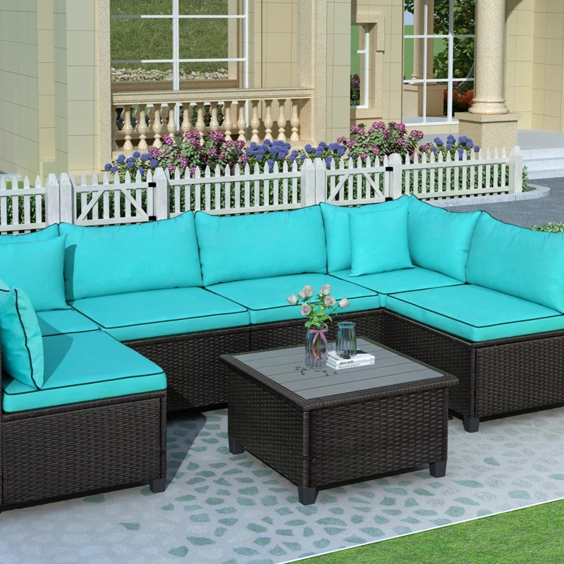 Transform your outdoor space into a prime entertainment nook with this rattan wicker sofa set with matching planked coffee table. Featuring a hallmark U-Shape frame, this sofa is spacious in design and can seat up to six people comfortably without taking up too much space in your outdoor area. Outfitted with soft foam seating throughout with stuffed lumbar cushions, this U-shaped outdoor sectional will provide you and guests with just the right level of comfort support needed. Upholstered in a soft fabric blend, this outdoor sectional is available in a vivid white or turquoise color with contrasting piping detail to add brightness to your backyard, patio or poolside. With the frame crafted with quality tightly woven rattan, this piece is resistant to humidity, dust and fading.