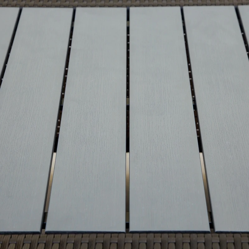 The cushions and decorative pillows are upholstered in a polyester blend fabric, formulated with high resistance to wear, stains, and fading. The planked WPC coffee table is crack resistant and designed for superior durability compared to glass or wood surfaces.