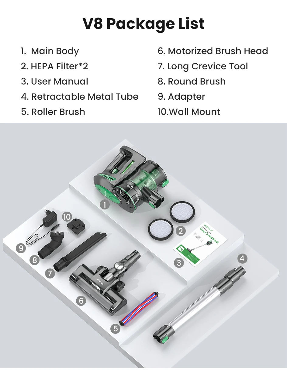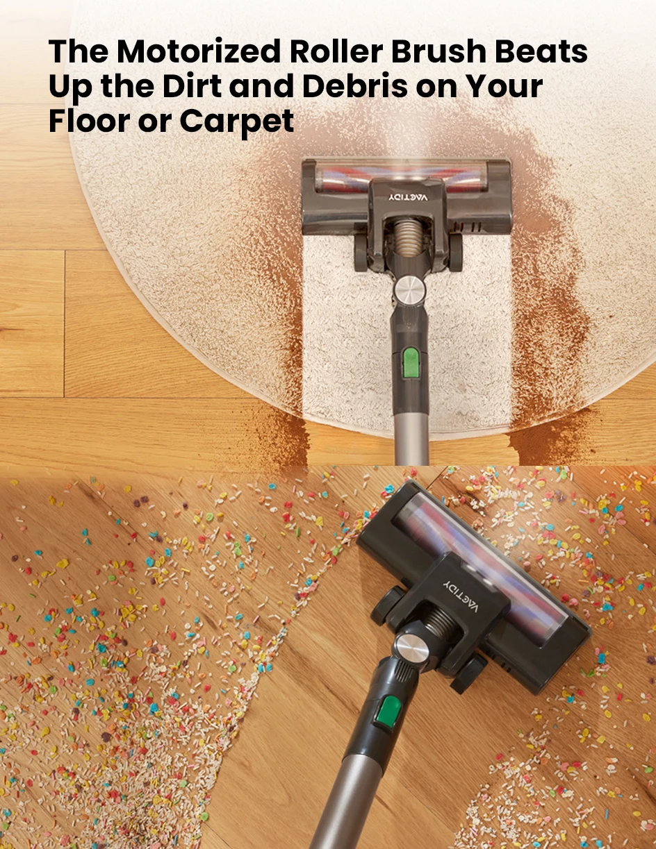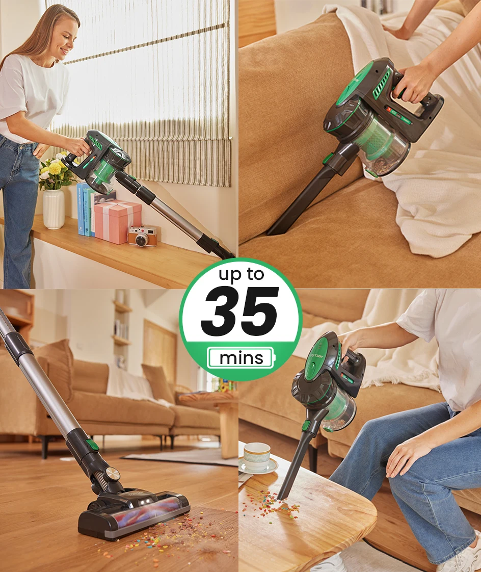 【Clean As PRO】The cordless vacuum V8 take a 2-in-1 turbine electric floor brush which stiff & soft bristles are integrated together on one roller,that truly works excellent on carpets and floors. Standard Mode - 12kPa is suitable for all kinds of floors cleaning tasks, while deep carpet cleaning is made a breeze in Strong Mode - 22kPa.
