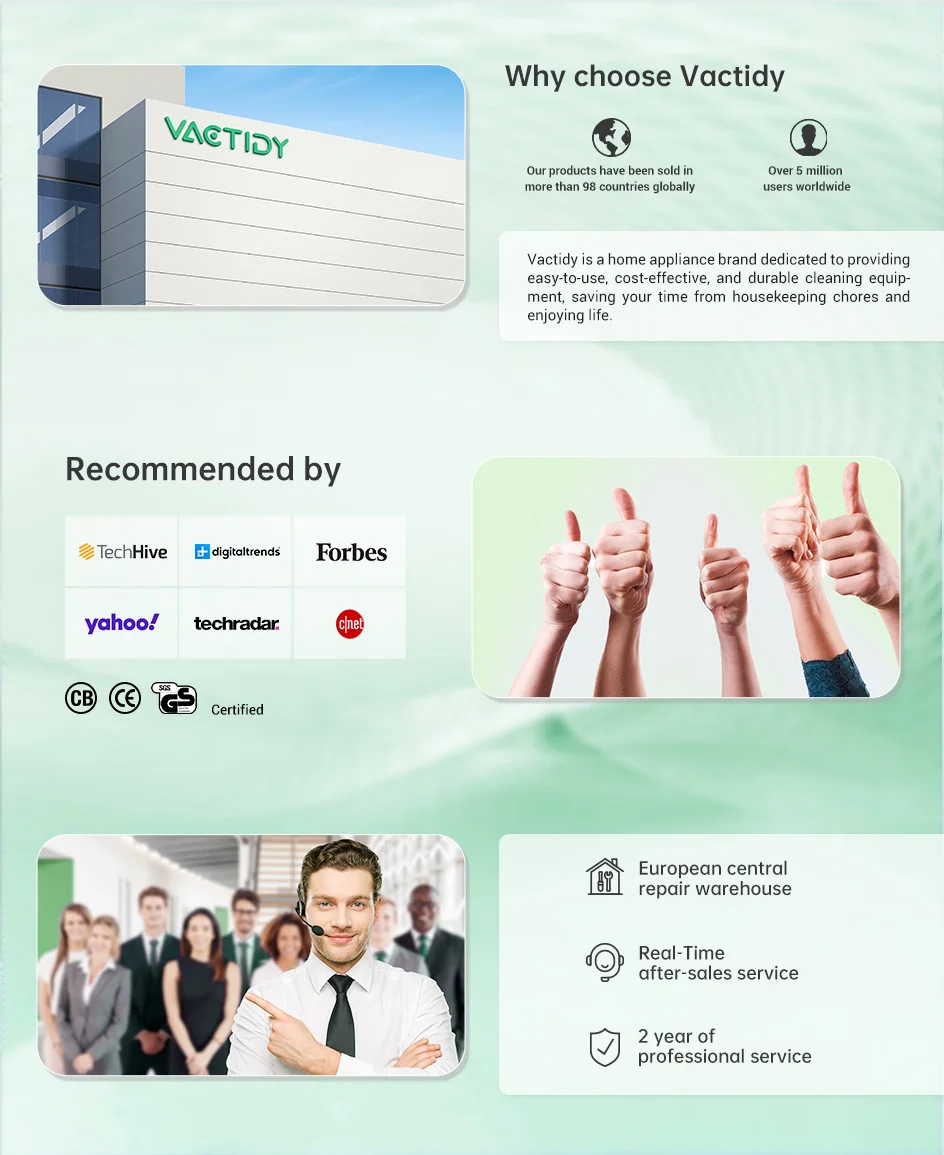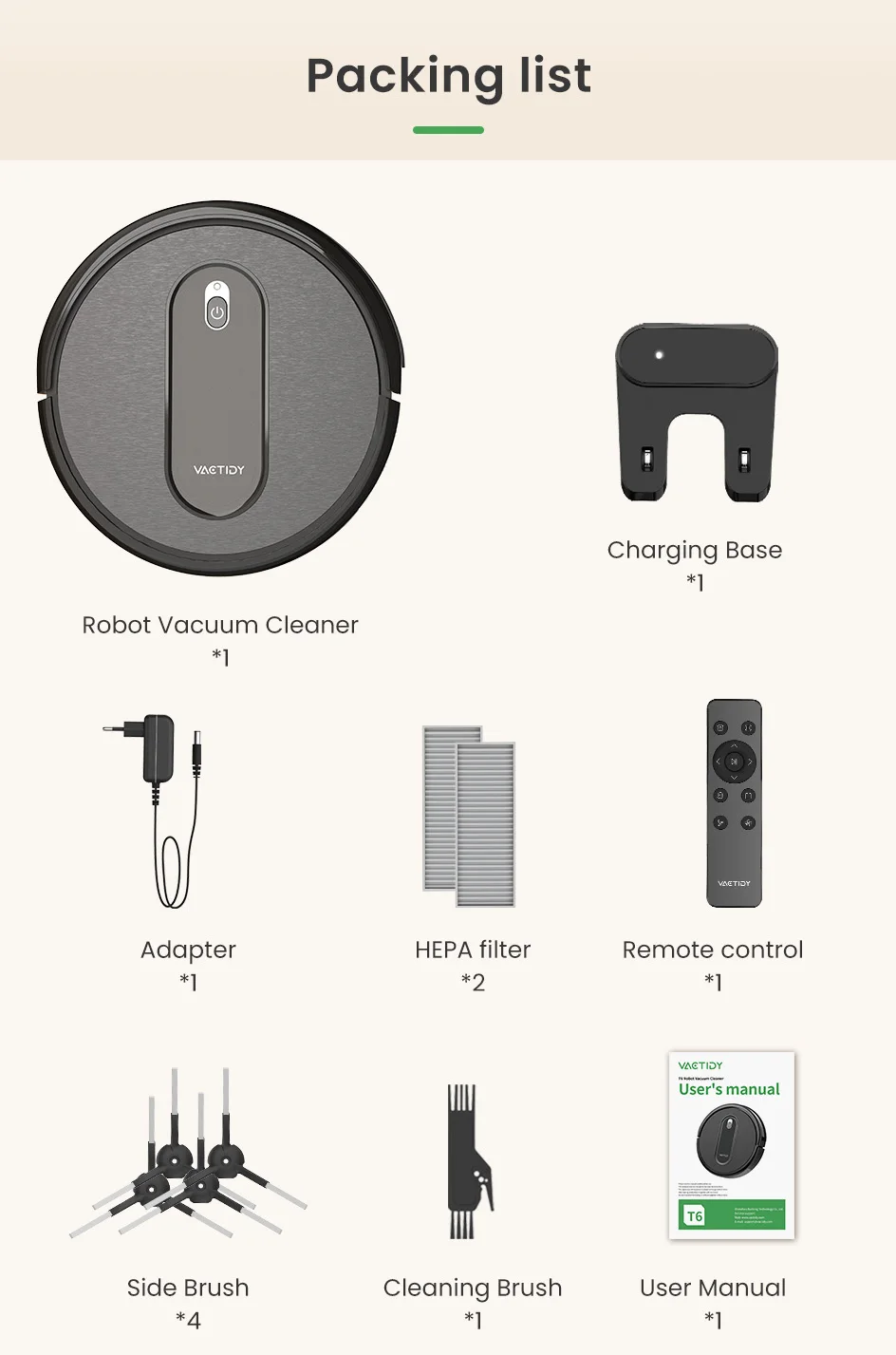 【What You Get】Vactidy T6 Vacuum Robot, Remote Control (2 AAA batteries included), Charging Base, Power Adapter, 500ML Dust Bin, 2 HEPA filter, 4 Side Brushes, Cleaning Tool, User Manual. Professional customer service and 24-month worry-free warranty!