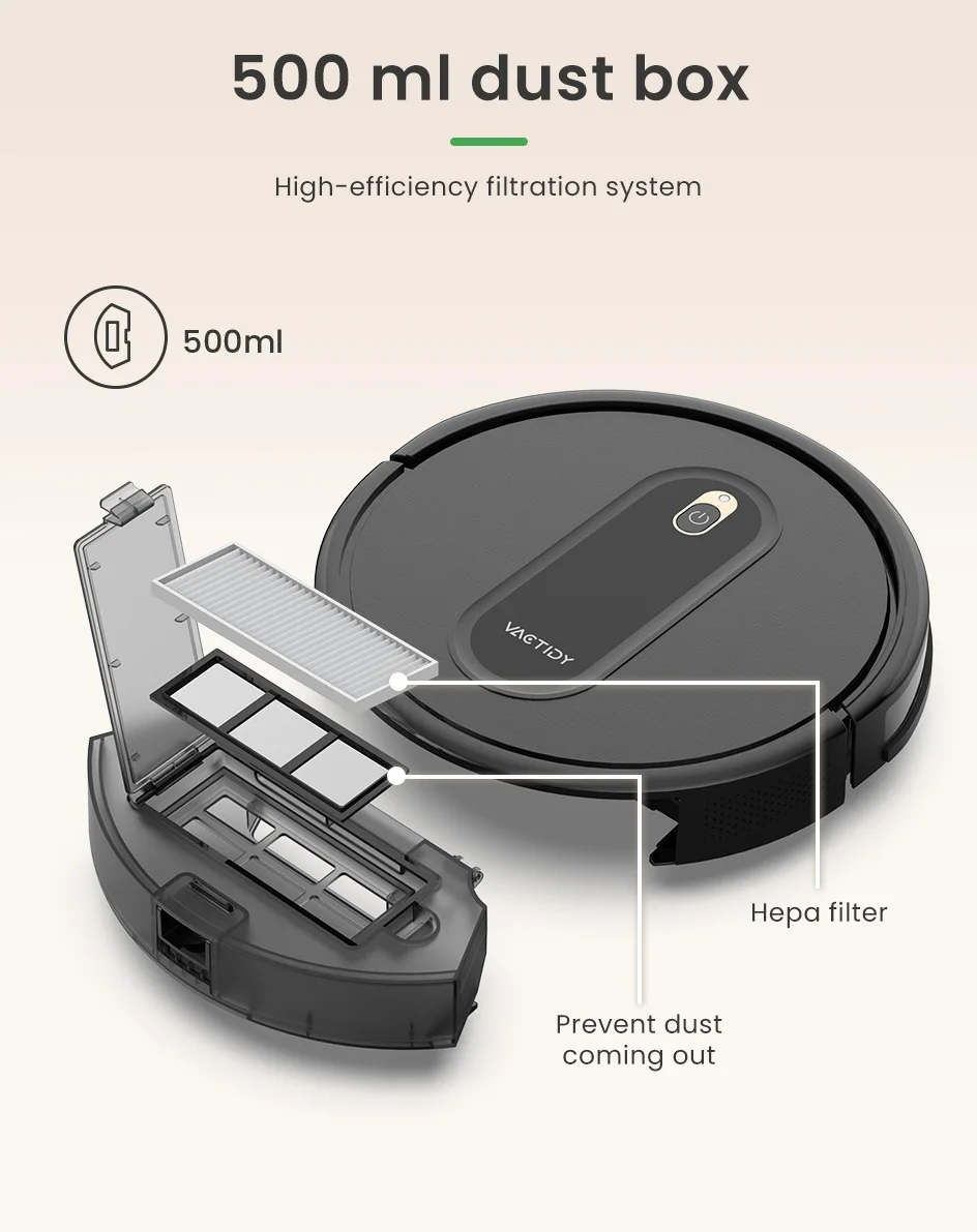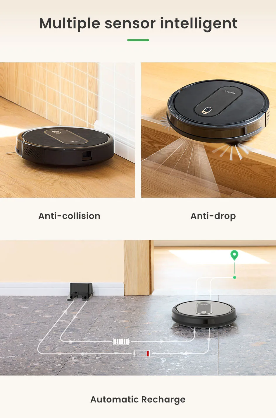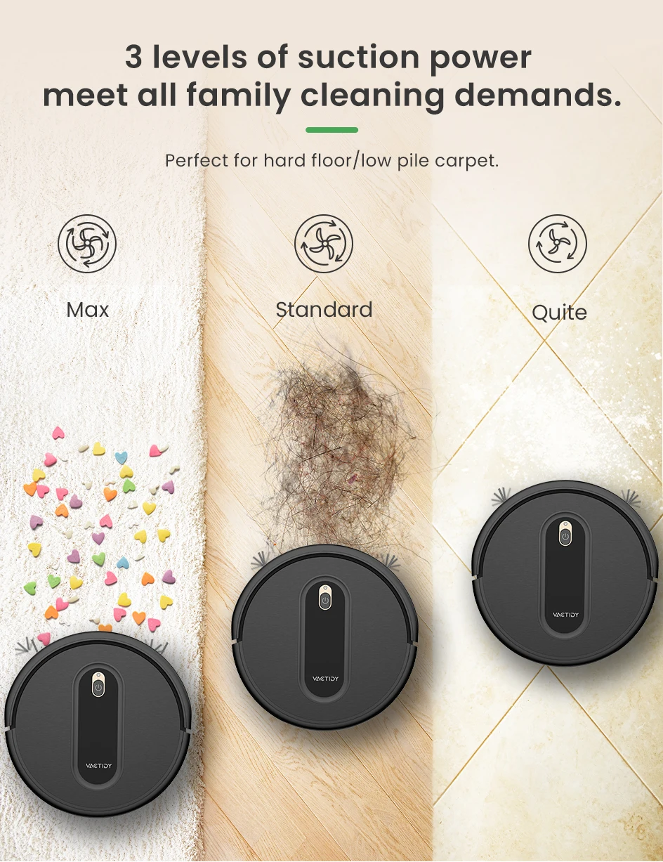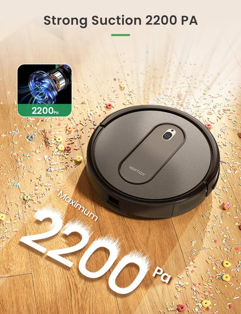 【Powerful Suction with Ease】With up to 2200Pa strong suction in max mode, Vactidy T6 robot vacuum can pick up dust, debris and pet hairs from hard floor and low-piled carpet with ease, bringing you a high-efficiency clean.