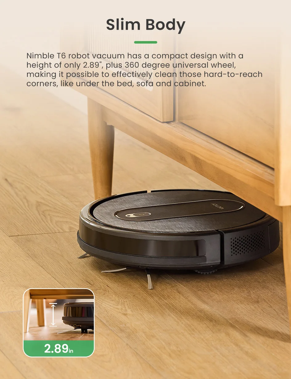 【Slim Body & Quiet Clean】Nimble T6 robot vacuum has a compact design with a height of only 2.89", plus 360 degree universal wheel, making it possible to effectively clean those hard-to-reach corners, like under the bed, sofa and cabinet. 60dB low noise in quiet mode will not disturb you, so you can do job rest assured.