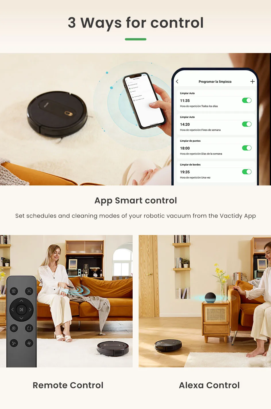 【Diverse Cleaning Modes】Robotic vacuum cleaner offers 3 clean modes including ➊Auto cleaning ➋Spot cleaning ➌Edge cleaning . Freely switch among different modes and power levels as you want via the Vactidy App. Preset a working time to get your T6 robot to start its daily routine cleaning.