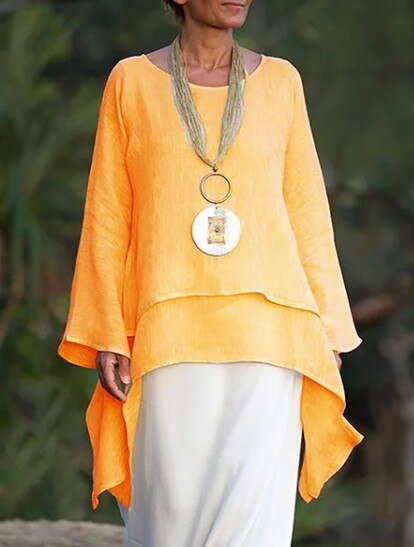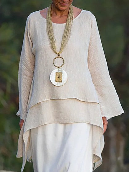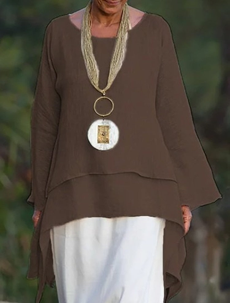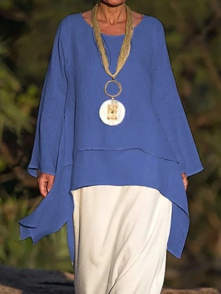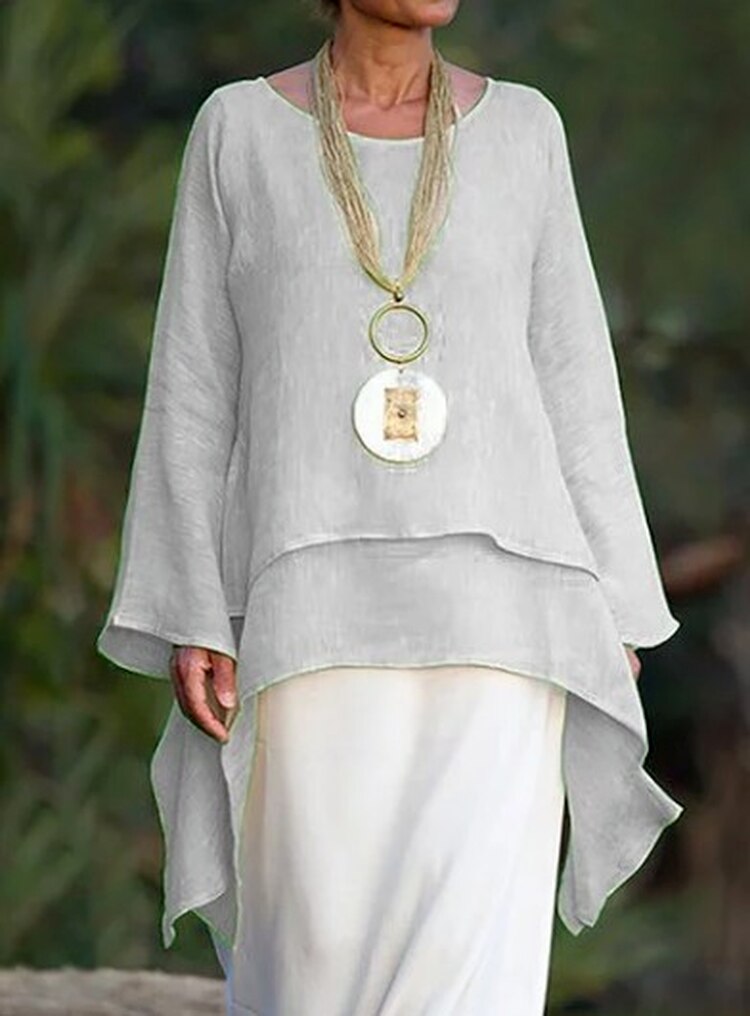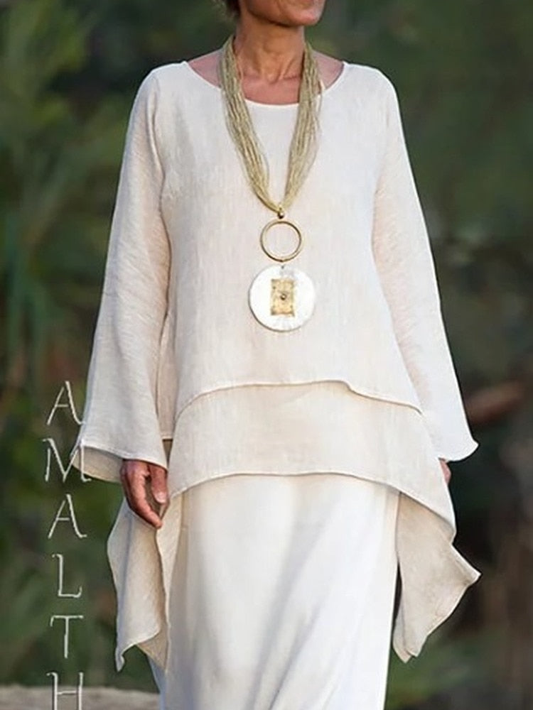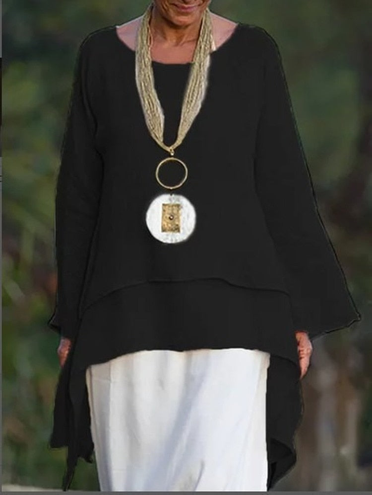 Women Tops Casual O Neck Long-sleeve Double-layers Blouses White Black Solid Oversized Irregular Long Top Blusas Mujer